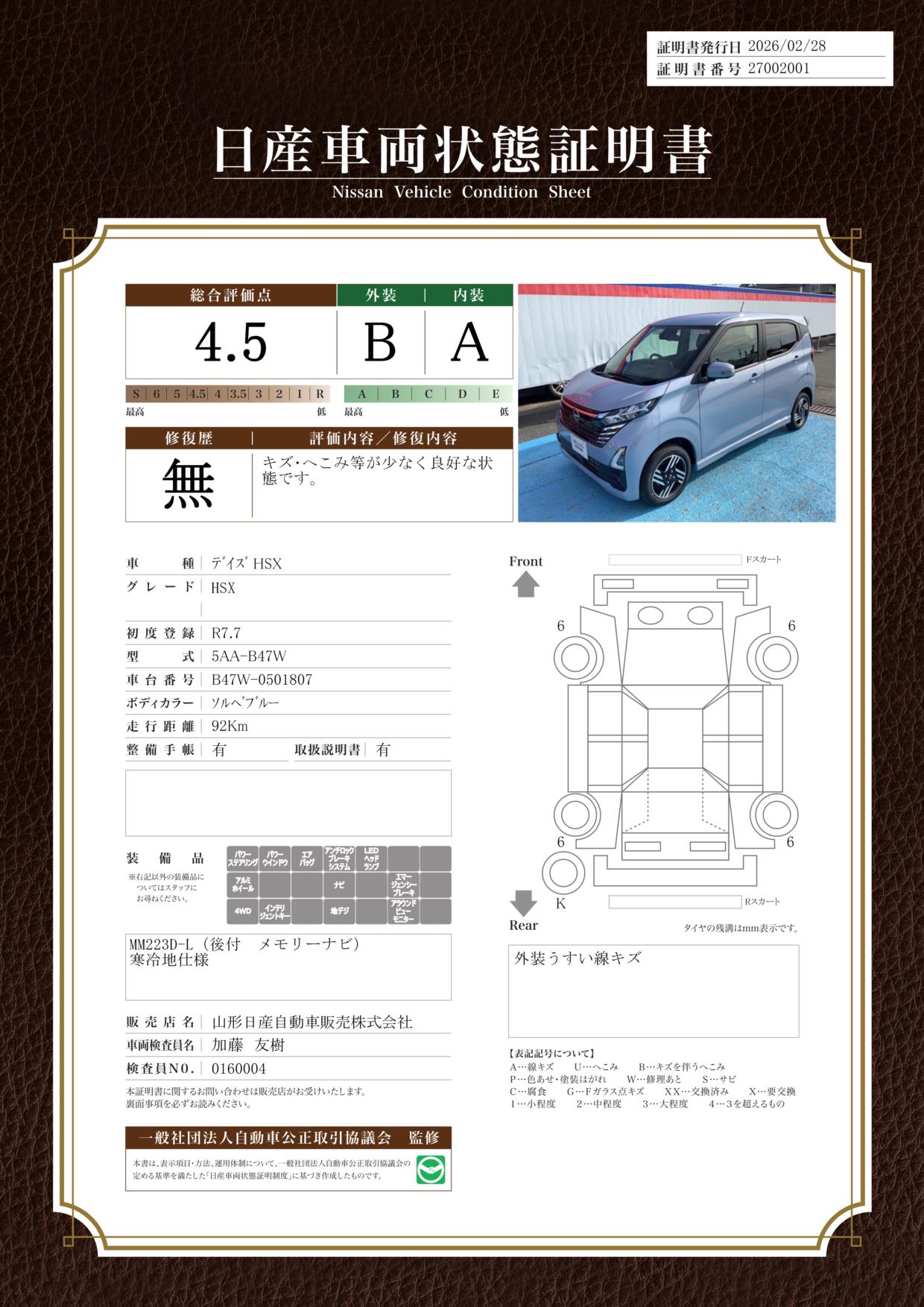 「車両状態証明書」は、査定協会監修のプロの検査員が公正かつ確かな基準で検査した”安心の証”です。