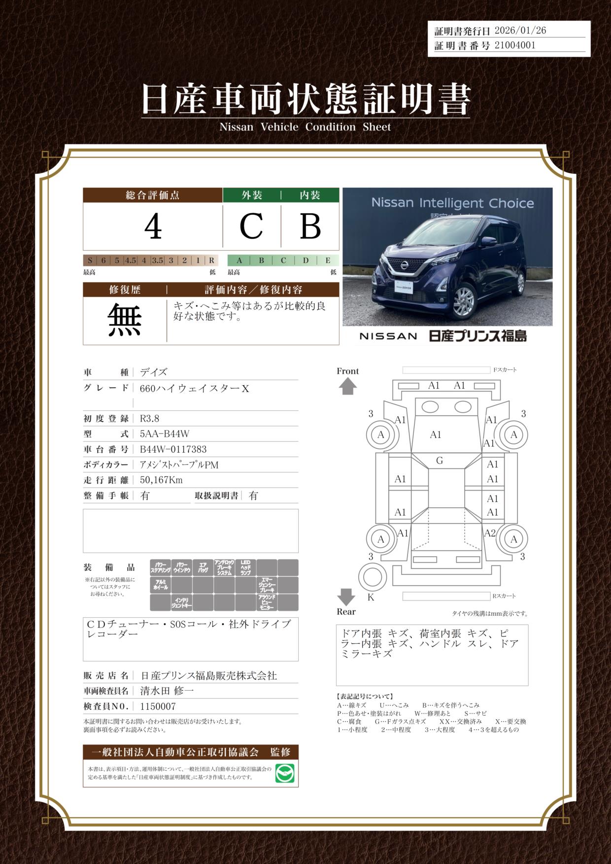 現状括弧書き内の年月まで車検有効期限が残っていますが、ご成約時に新しく車検を取り直します。なお取り直しの費用は車両価格に含まれています。