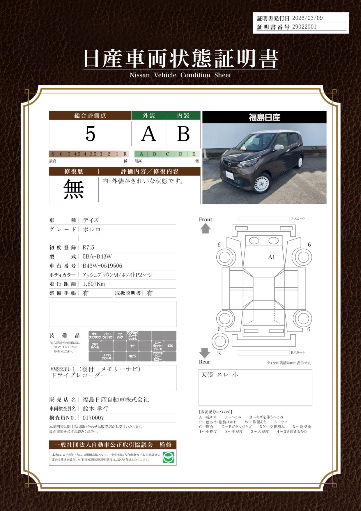「車両状態証明書」は、査定協会監修のプロの検査員が公正かつ確かな基準で検査した”安心の証”です。