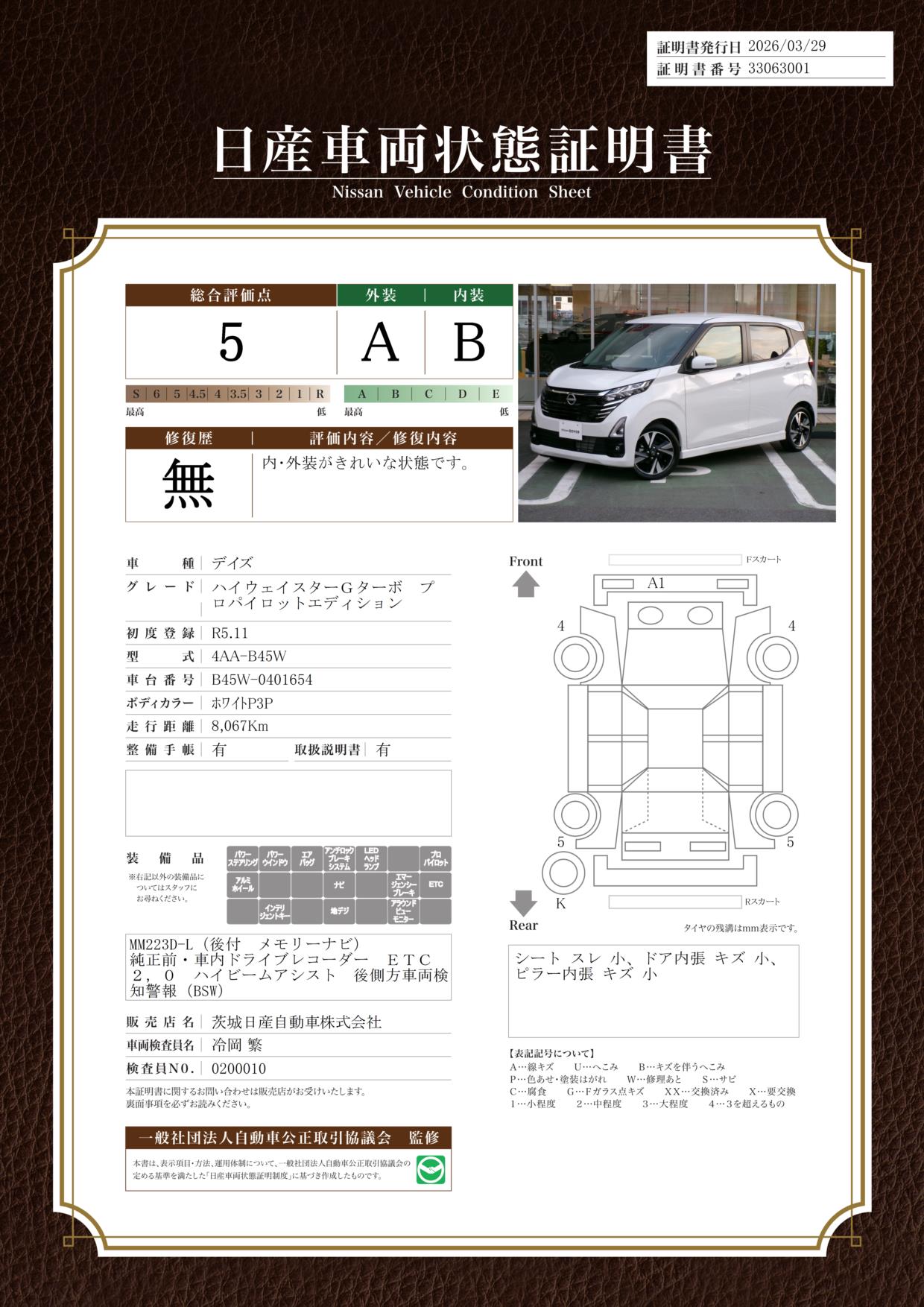 「車両状態証明書」は、査定協会監修のプロの検査員が公正かつ確かな基準で検査した”安心の証”です。