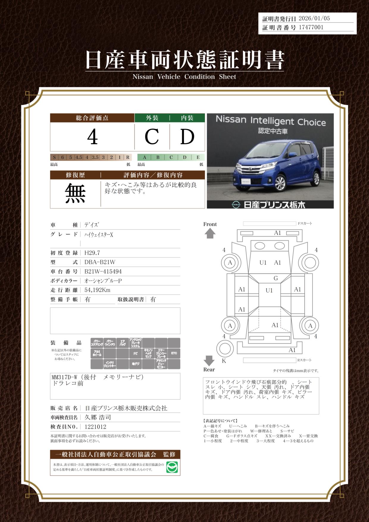 現状括弧書き内の年月まで車検有効期限が残っていますが、ご成約時に新しく車検を取り直します。なお取り直しの費用は車両価格に含まれています。