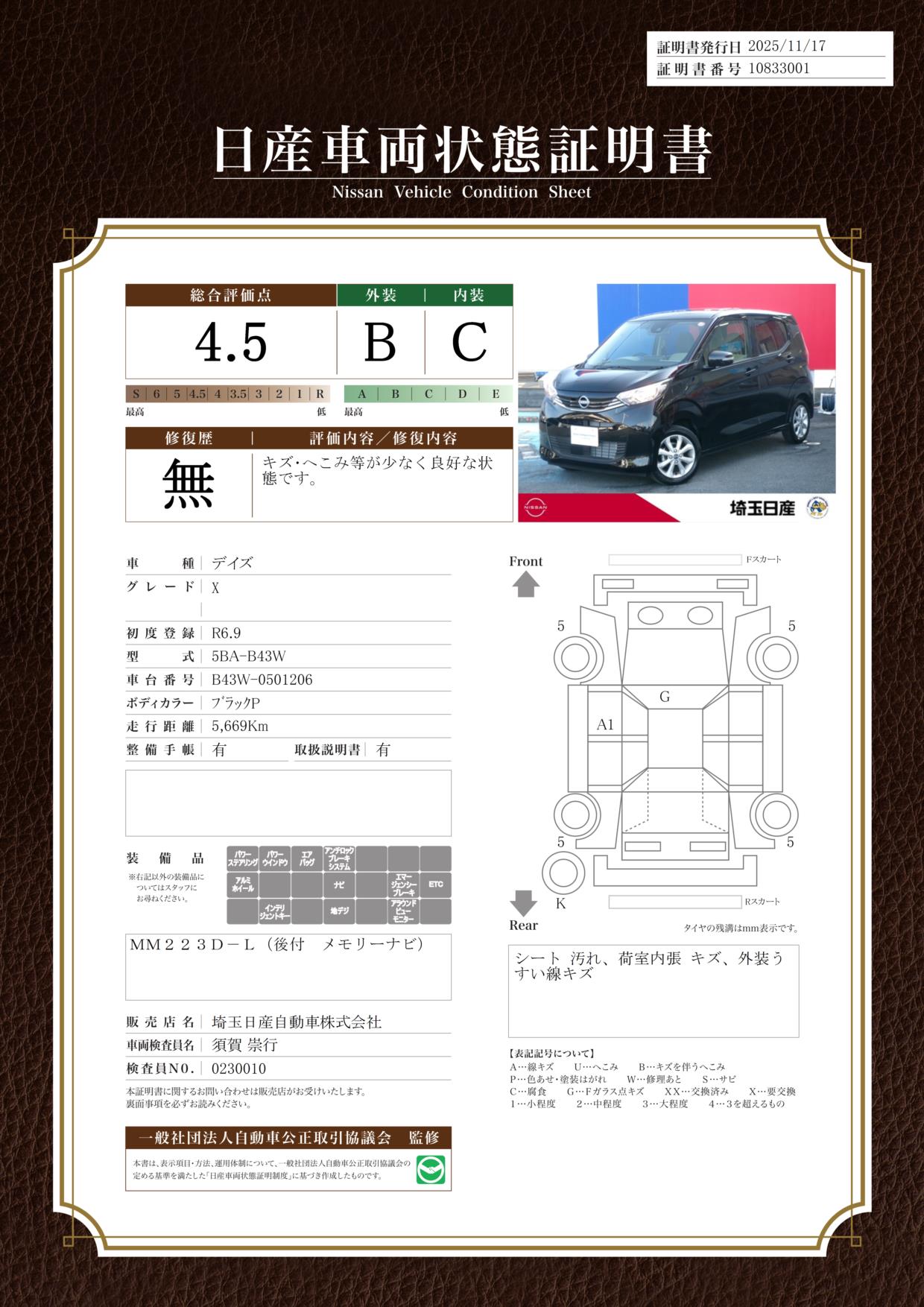 評価機関 : 日産車両状態証明