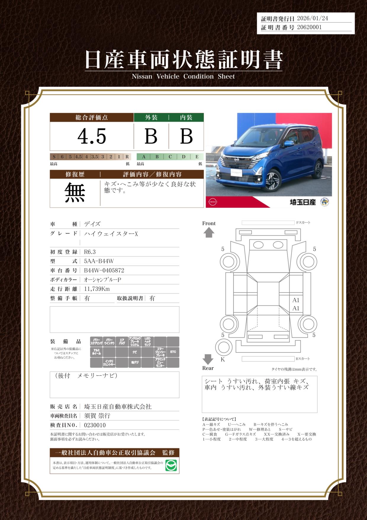 現状括弧書き内の年月まで車検有効期限が残っていますが、ご成約時に新しく車検を取り直します。なお取り直しの費用は車両価格に含まれています。