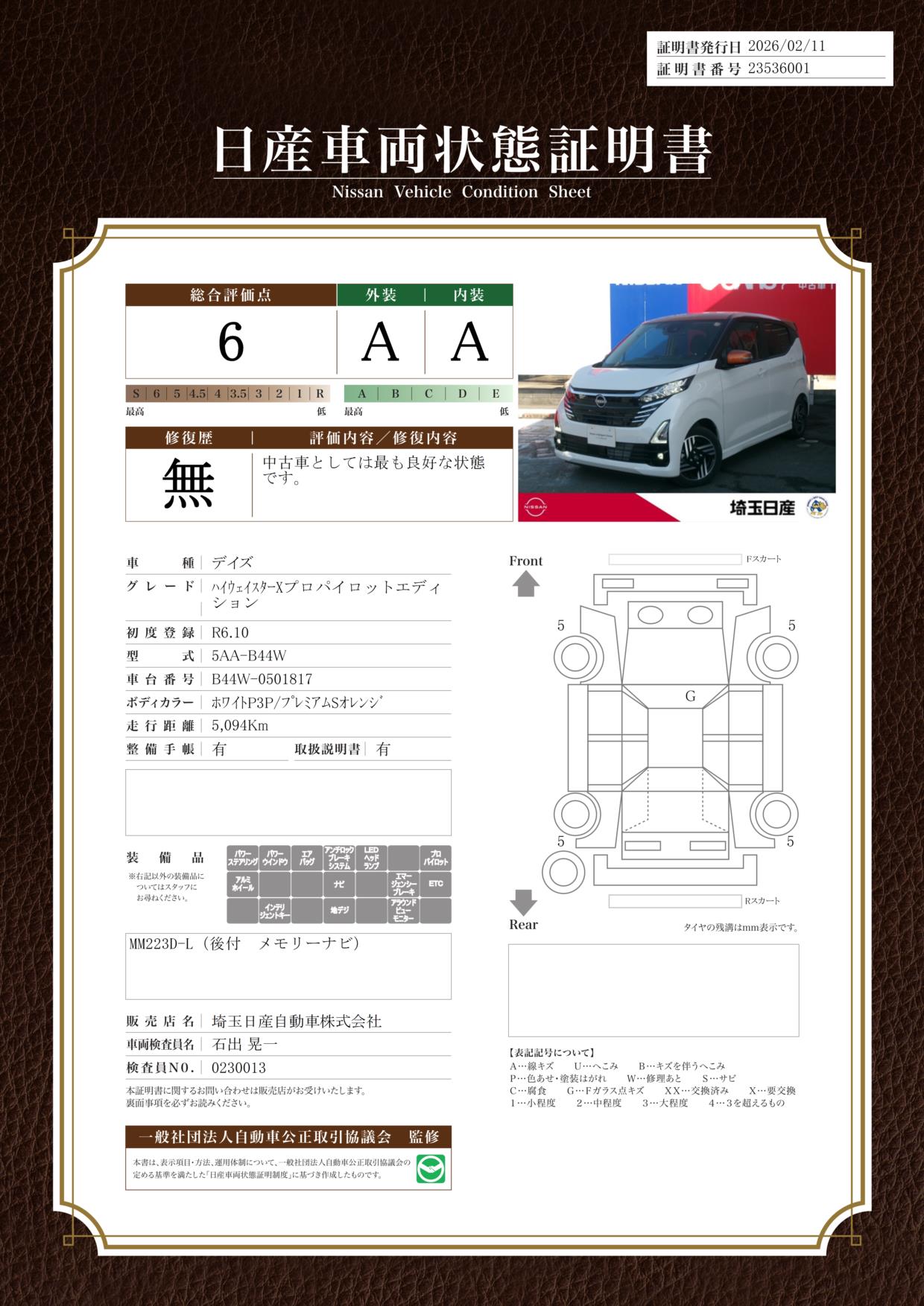 「車両状態証明書」は、査定協会監修のプロの検査員が公正かつ確かな基準で検査した”安心の証”です。