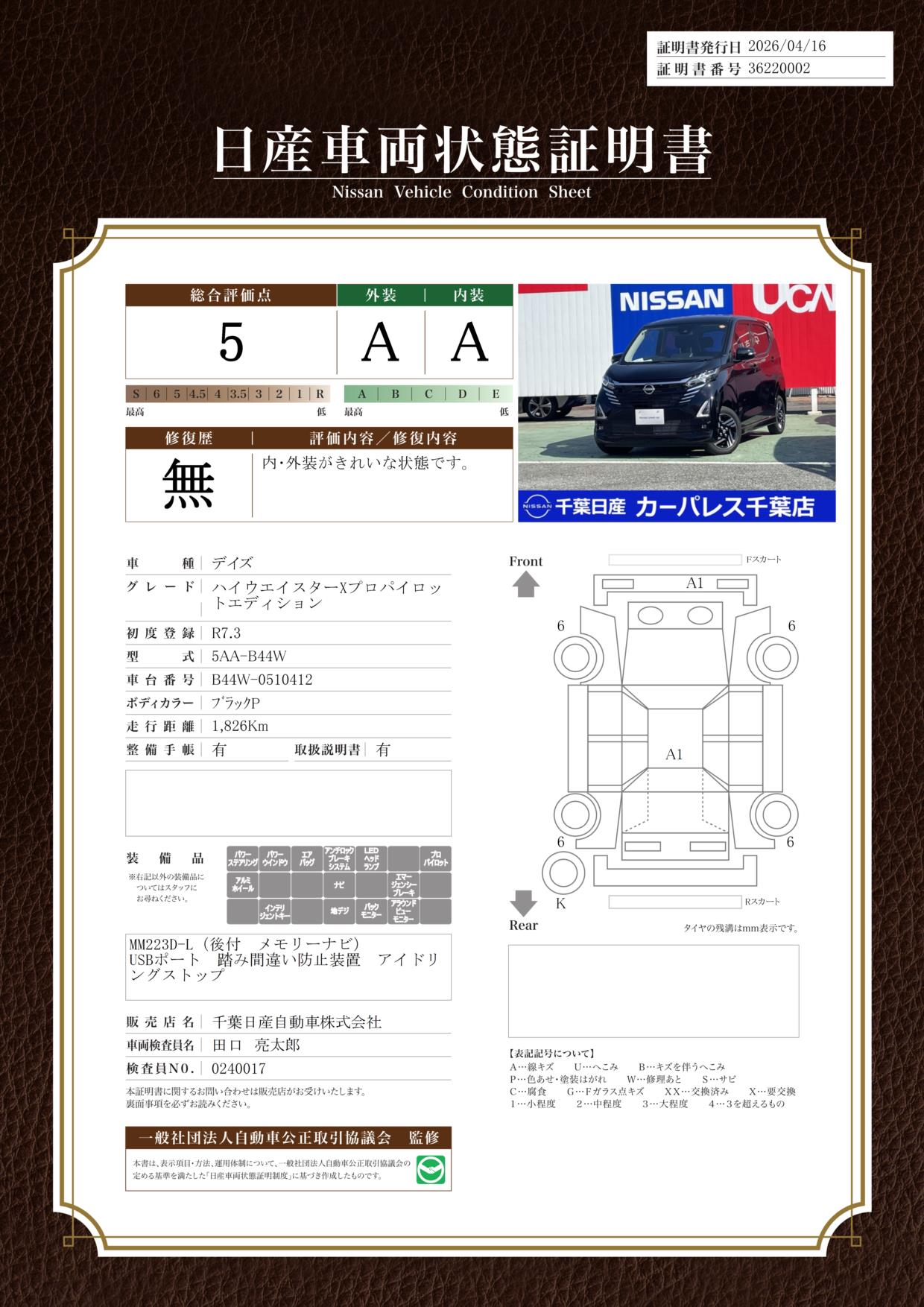 「車両状態証明書」は、査定協会監修のプロの検査員が公正かつ確かな基準で検査した”安心の証”です。