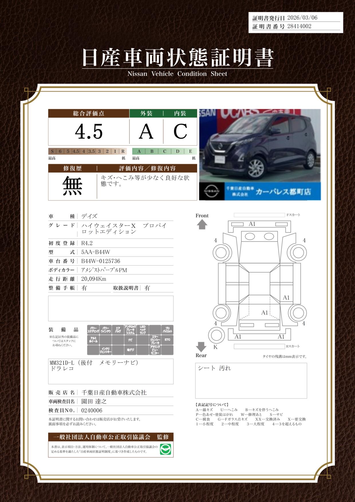 ●日産認定のクオリティショップです。日産プレミアム認定中古車、日産認定中古車、日産電動車を中心とした高品質な中古車を展示しております。 ●日産の中古車無料保証「ワイド保証」つきで安心です。他社の保証内容とぜひ見比べてください。 ●国道126号線沿いでアクセス抜群です。 ●キッズスペースもございますのでお子様連れでも安心です。 ●最寄り駅: JR千葉駅 ※公共交通機関でご来場のお客様はお声がけください。お迎えにあがります。 ●リモート商談も可能です。