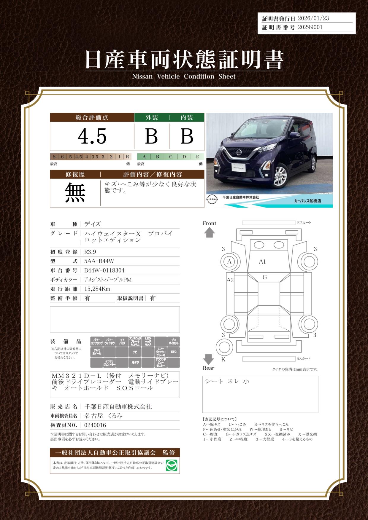 評価機関 : 日産車両状態証明