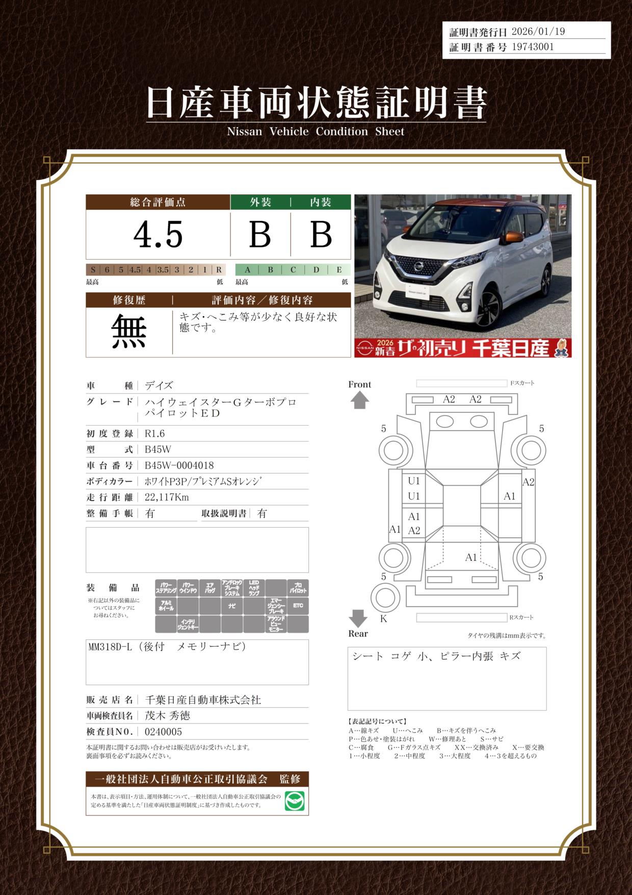 評価機関 : 日産車両状態証明