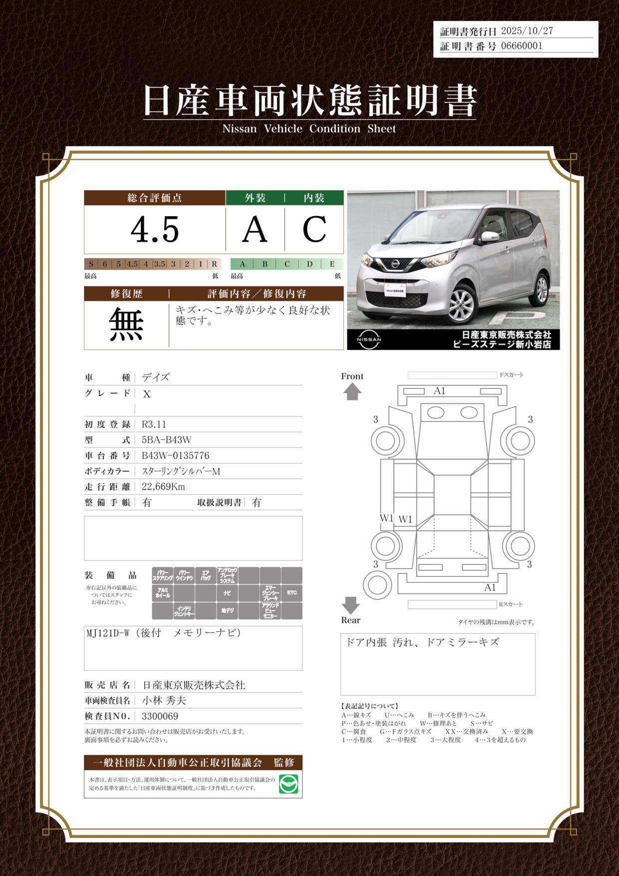 評価機関 : 日産車両状態証明