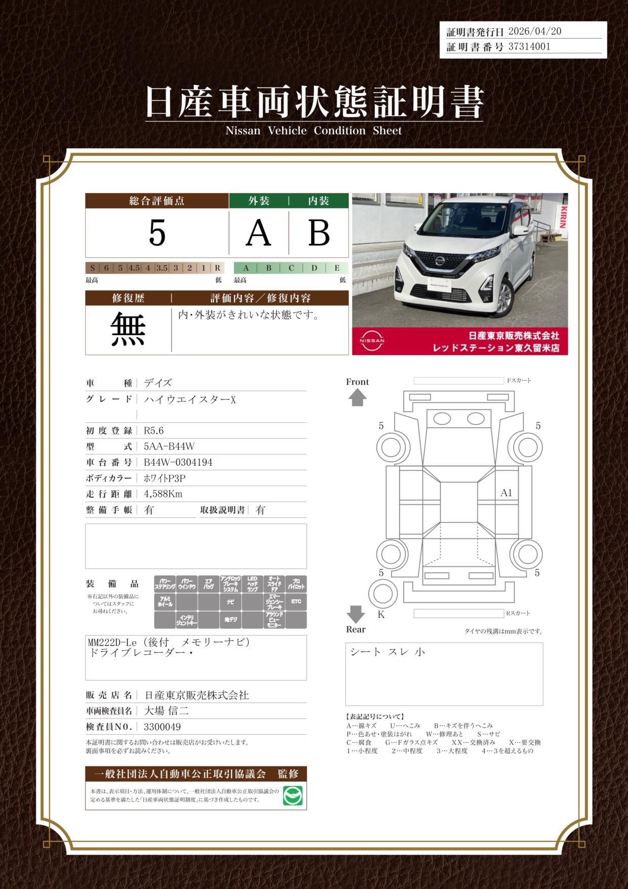 「車両状態証明書」は、査定協会監修のプロの検査員が公正かつ確かな基準で検査した”安心の証”です。