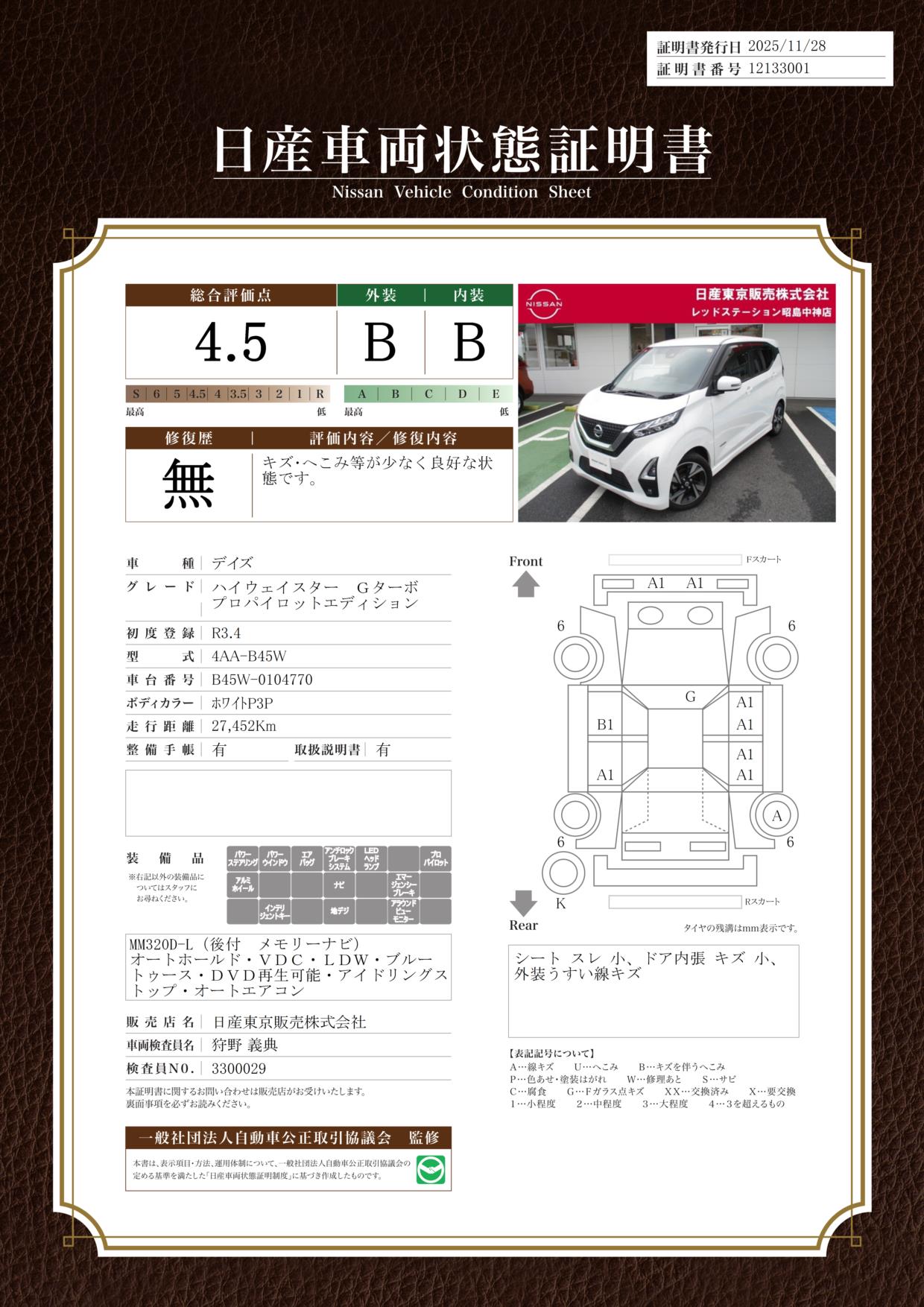 評価機関 : 日産車両状態証明