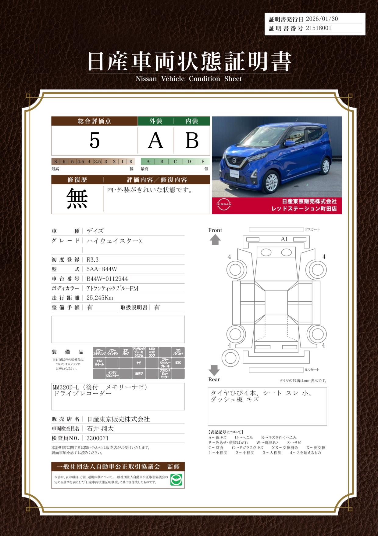 現状括弧書き内の年月まで車検有効期限が残っていますが、ご成約時に新しく車検を取り直します。なお取り直しの費用は車両価格に含まれています。