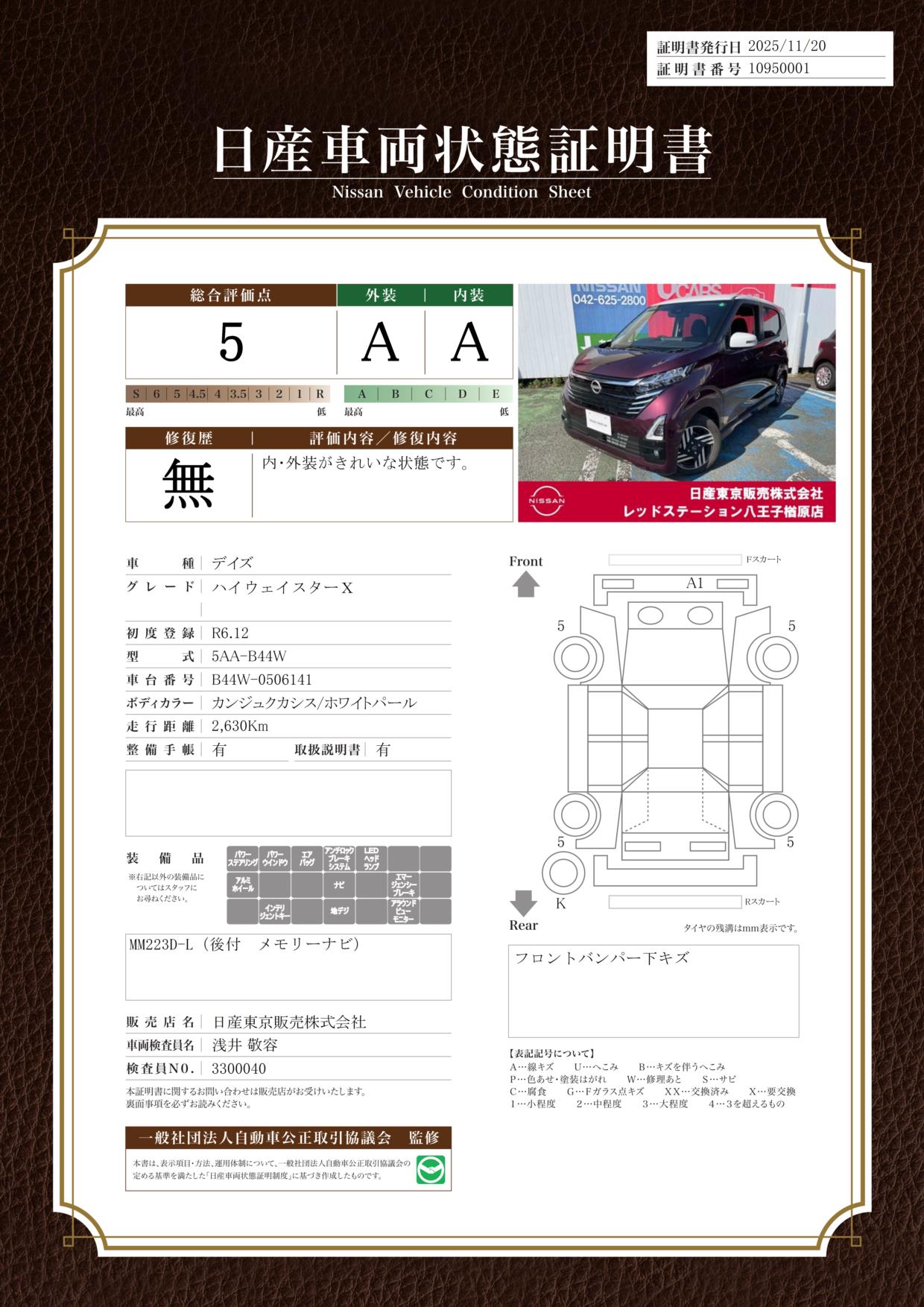 ◇◆歳末大感謝祭◆◇実施中! 在庫台数、正規ディーラー都内最大規模で素敵な一台をご案内させていただきます☆ 日産東京限定!クルマの費用を定額に中古車のサブスク☆込みッと定額☆ お電話や休暇中のメールお問い合わせもお待ちしております! 電車バスでお越しになる場合はJR中央線 西八王子駅北口1番乗り場楢原町行きバス終点の楢原町から徒歩5分! ※定休日※ 12/2(火).9(火).16(火).23(火).28(日)~1/3(土)