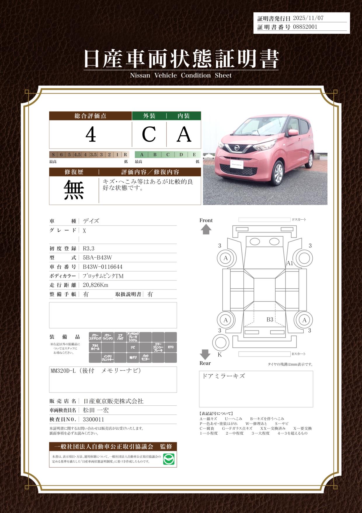 評価機関 : 日産車両状態証明