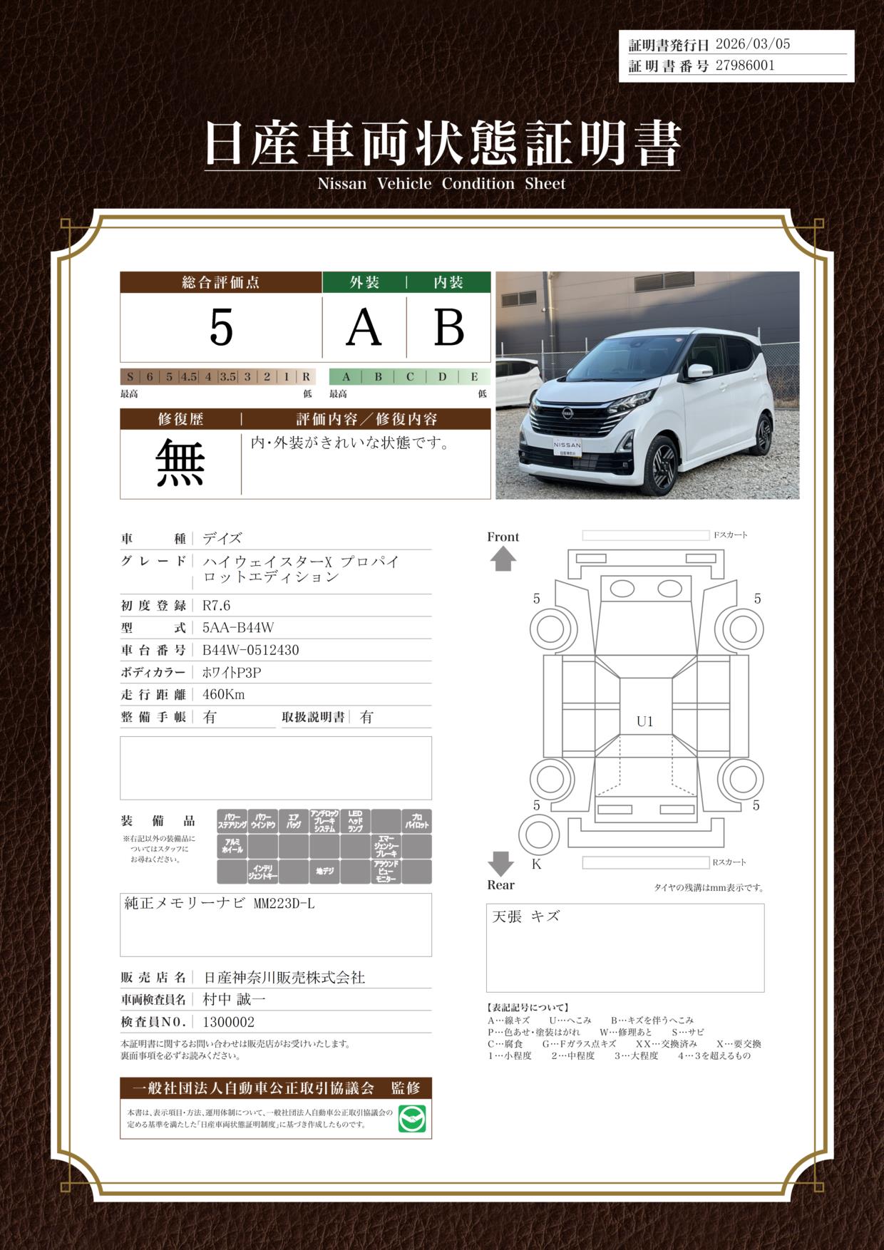 「車両状態証明書」は、査定協会監修のプロの検査員が公正かつ確かな基準で検査した”安心の証”です。