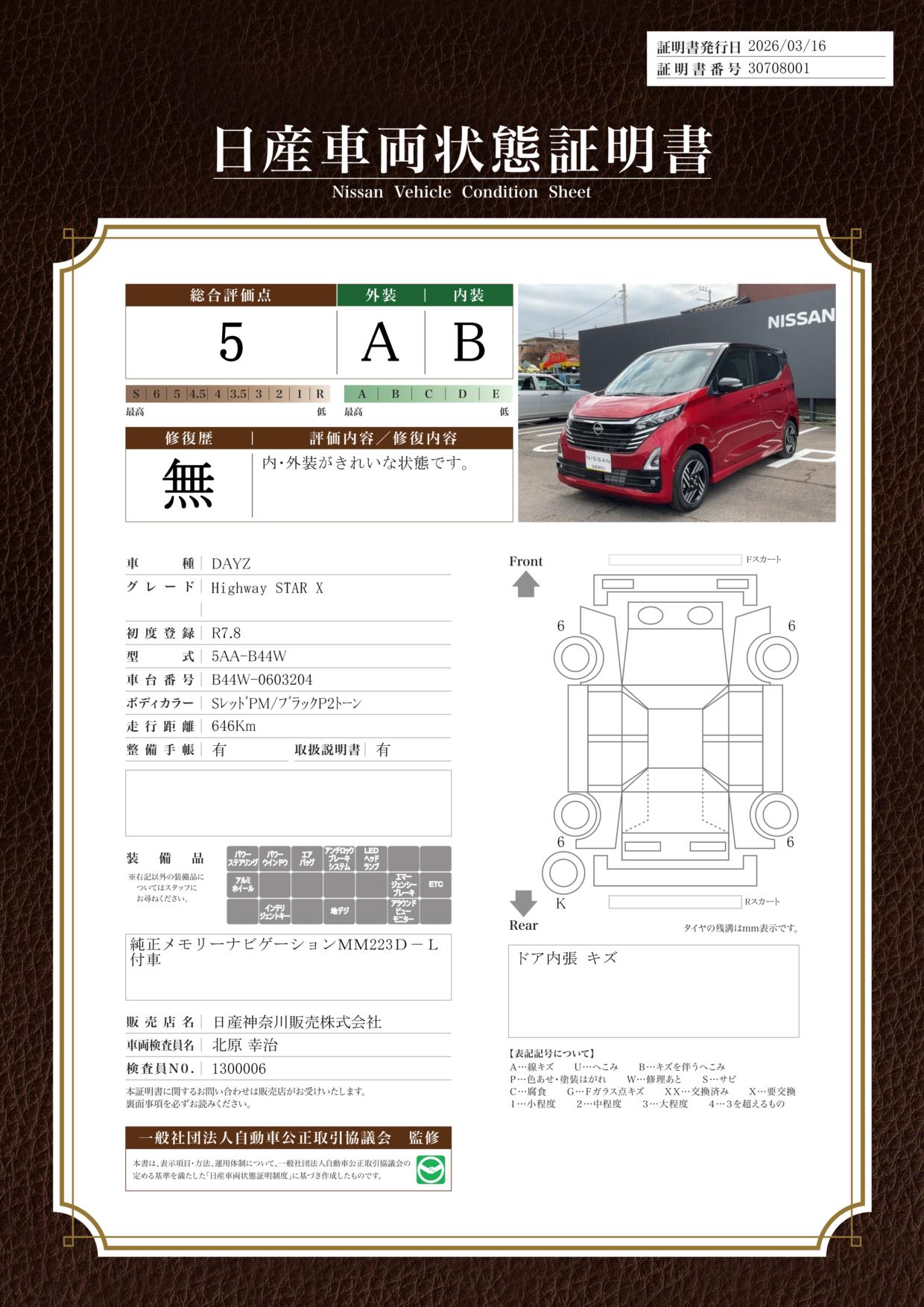 「車両状態証明書」は、査定協会監修のプロの検査員が公正かつ確かな基準で検査した”安心の証”です。