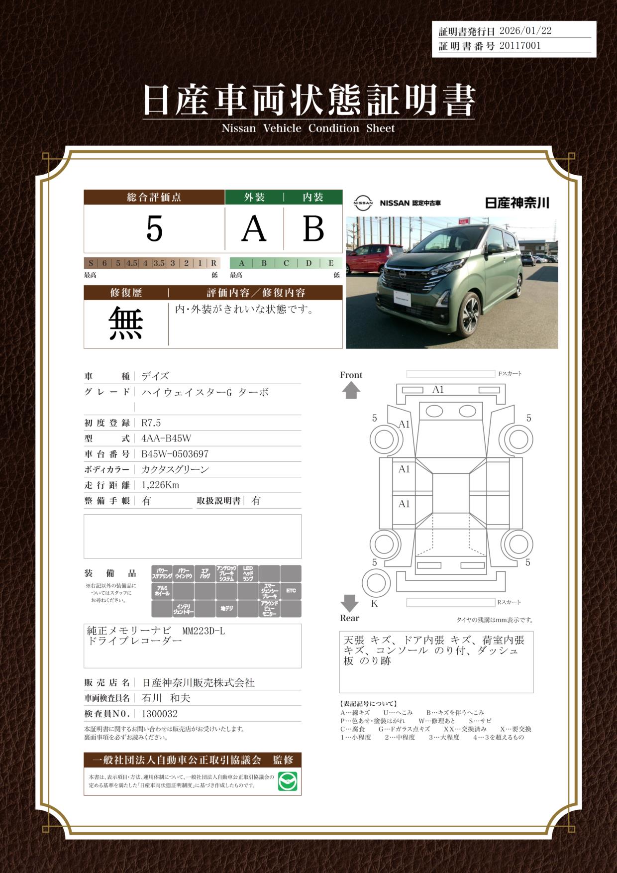 現状括弧書き内の年月まで車検有効期限が残っていますが、ご成約時に新しく車検を取り直します。なお取り直しの費用は車両価格に含まれています。