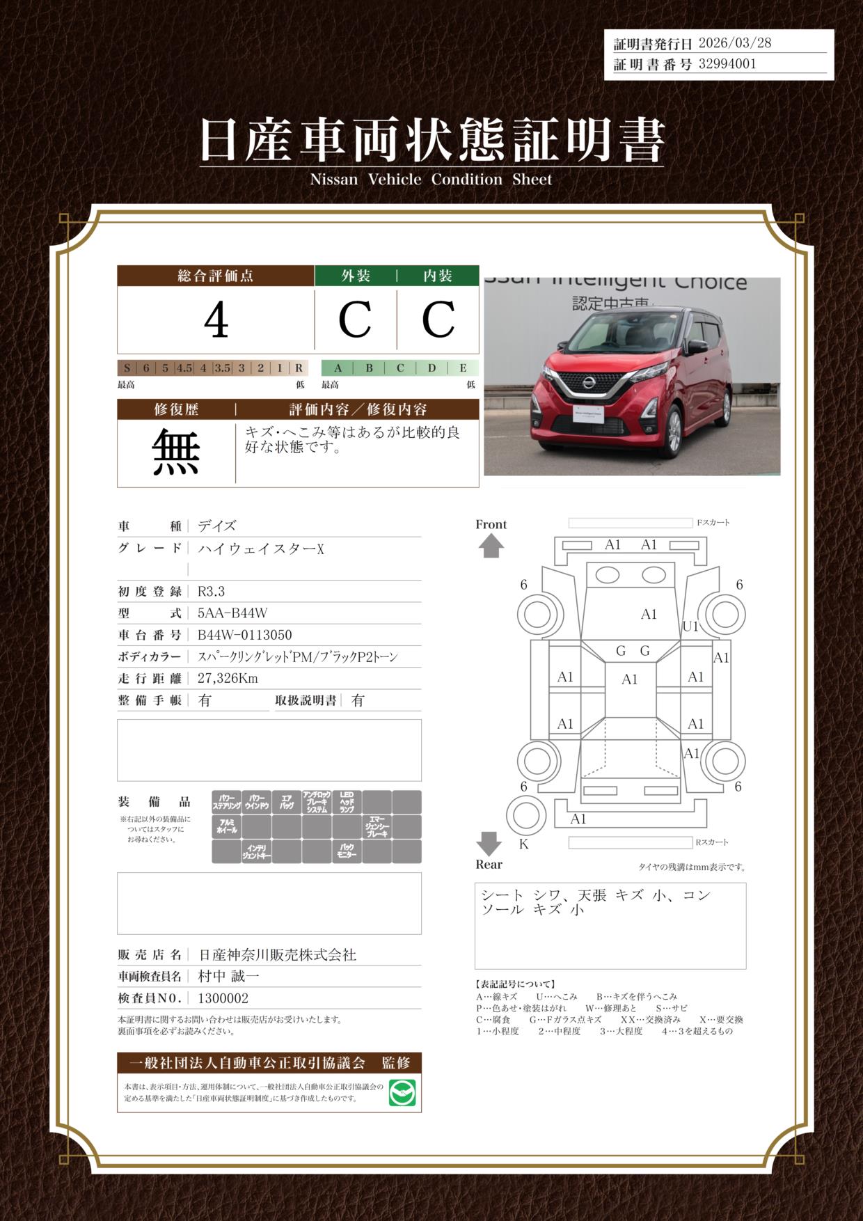 現状括弧書き内の年月まで車検有効期限が残っていますが、ご成約時に新しく車検を取り直します。なお取り直しの費用は車両価格に含まれています。
