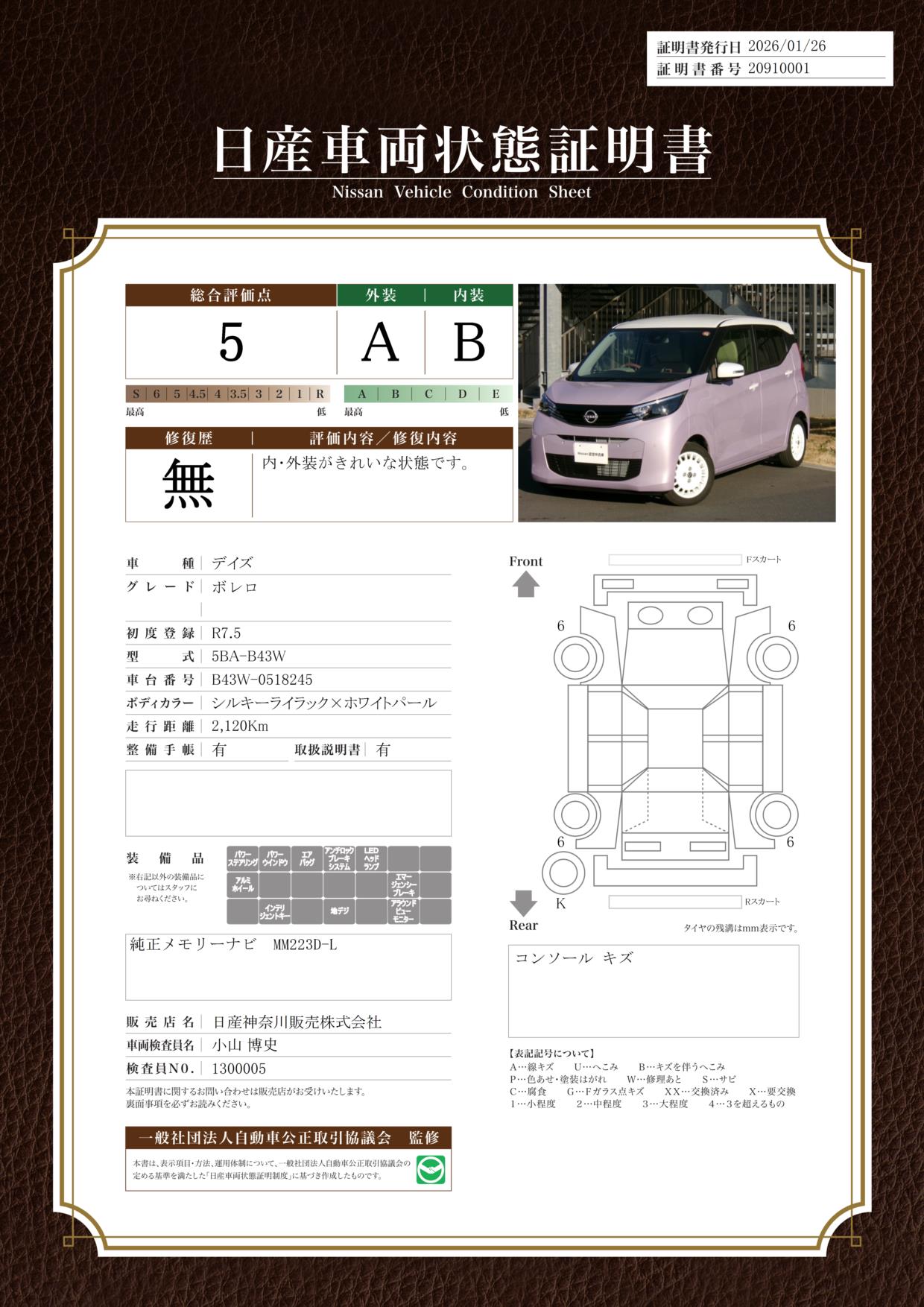 現状括弧書き内の年月まで車検有効期限が残っていますが、ご成約時に新しく車検を取り直します。なお取り直しの費用は車両価格に含まれています。