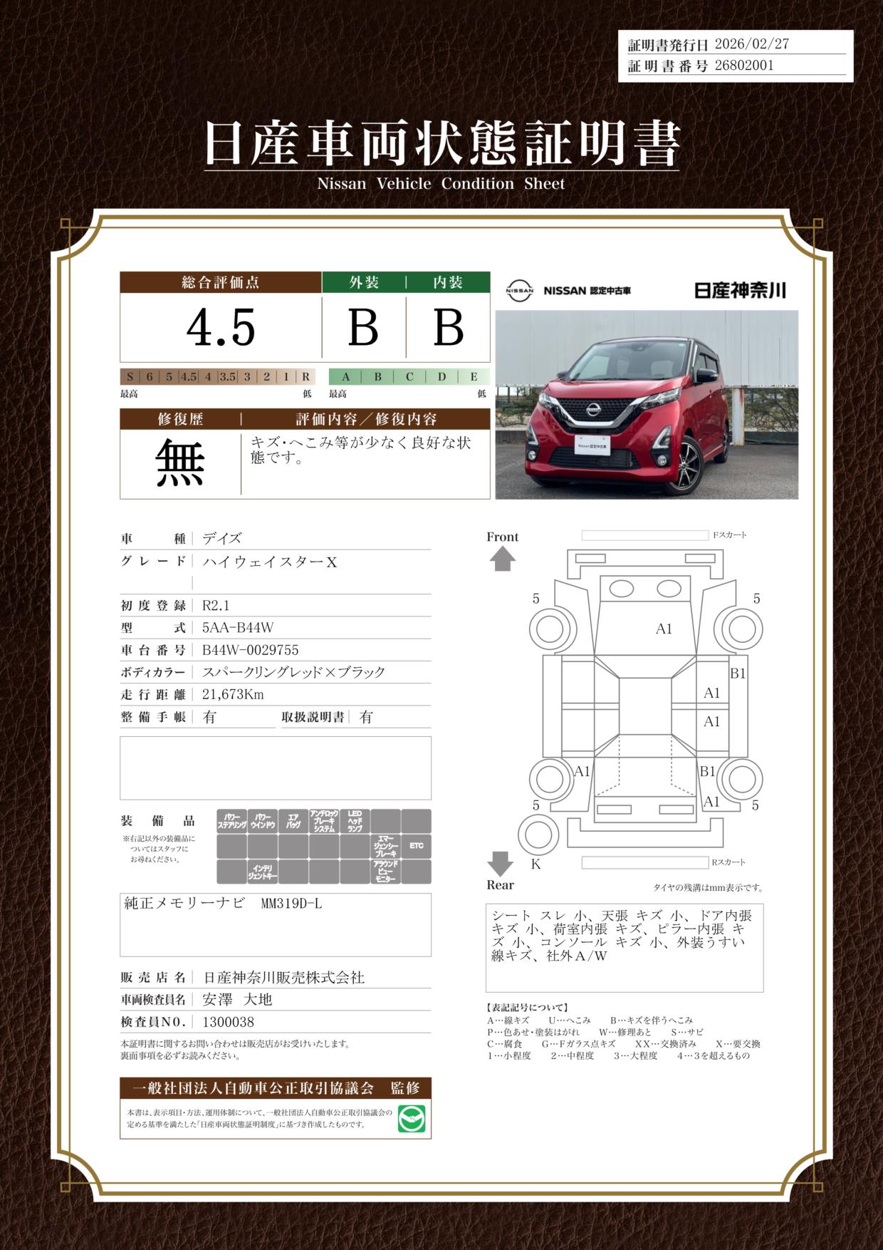 現状括弧書き内の年月まで車検有効期限が残っていますが、ご成約時に新しく車検を取り直します。なお取り直しの費用は車両価格に含まれています。