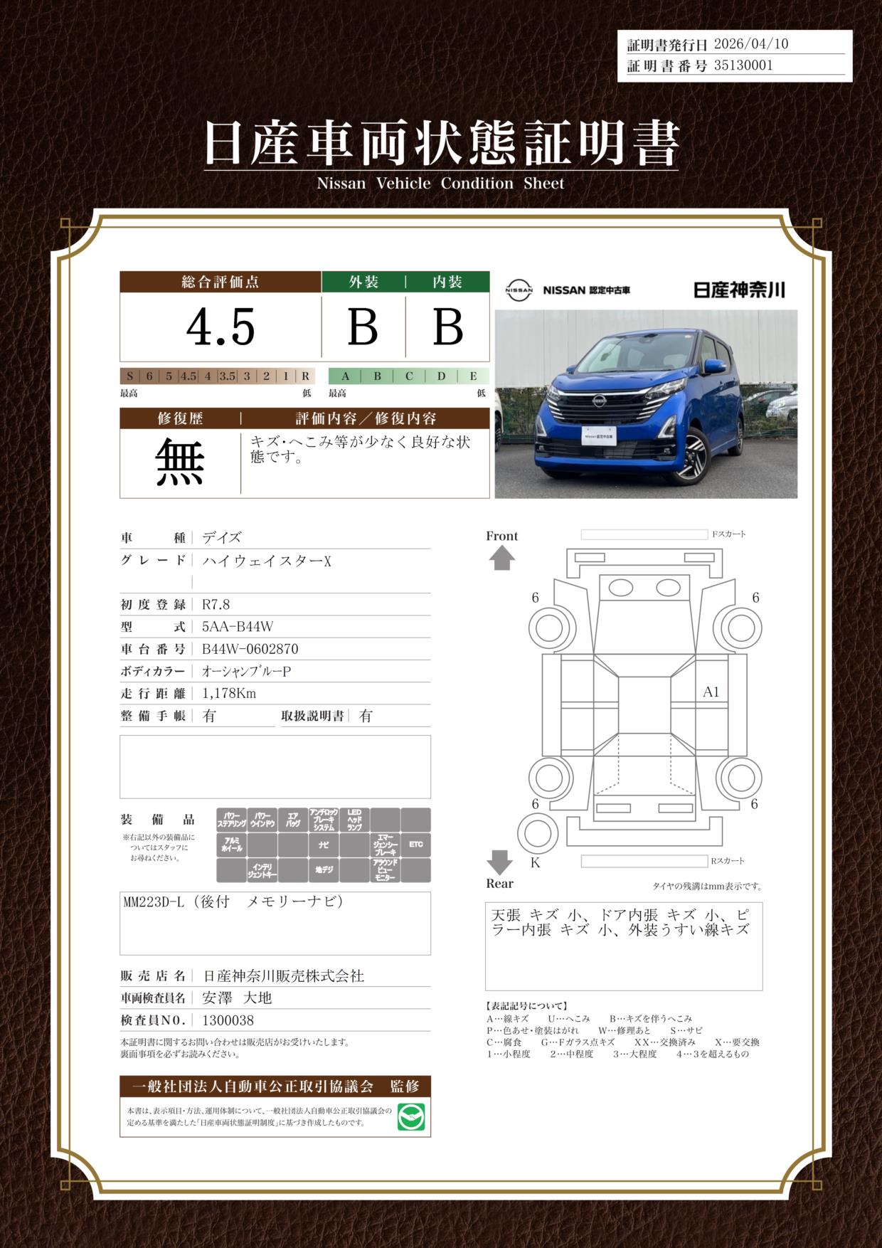 「車両状態証明書」は、査定協会監修のプロの検査員が公正かつ確かな基準で検査した”安心の証”です。