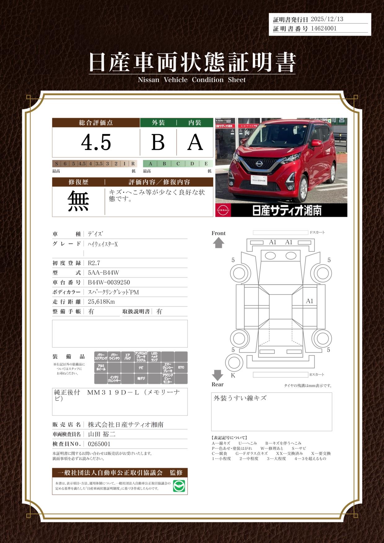 話題の車からお買い求めしやすい価格帯まで豊富に中古車を取り揃えております。日産車両状態証明検査の検査員資格をもつ当社専属スタッフが展示車をしっかりチェックし、車両状態証明書を発行しています。安心丸見えでお電話やメールのお問い合わせ、ご来店、オンラインのご相談をお待ちしております! ※定休日 1月・・・6日・7日(火・水)、13日(火)、20日・21日(火・水)、27日(火) ※年末年始休暇 12月28日(日)~1月3日(土)
