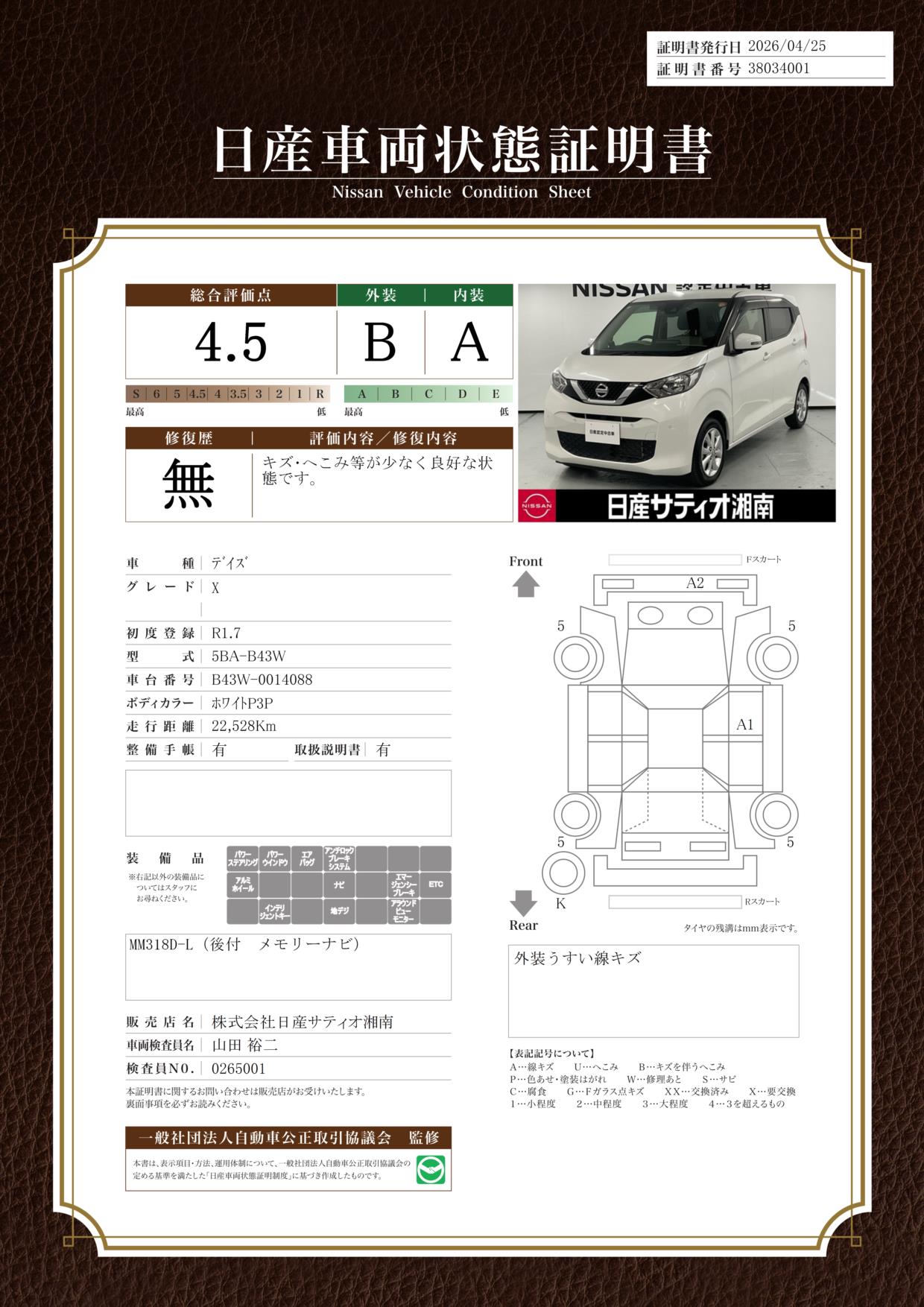 話題の車からお買い求めしやすい価格帯まで豊富に中古車を取り揃えております。日産車両状態証明検査の検査員資格をもつ当社専属スタッフが展示車をしっかりチェックし、車両状態証明書を発行しています。安心丸見えでお電話やメールでのお問い合わせ、ご来店、オンラインのご相談をお待ちしております! ※ ゴールデンウイーク休暇 4月28日~5月5日 ※定休日 5月の定休日は・・・12日(火)、19日、20日(火、水)、26日(火)