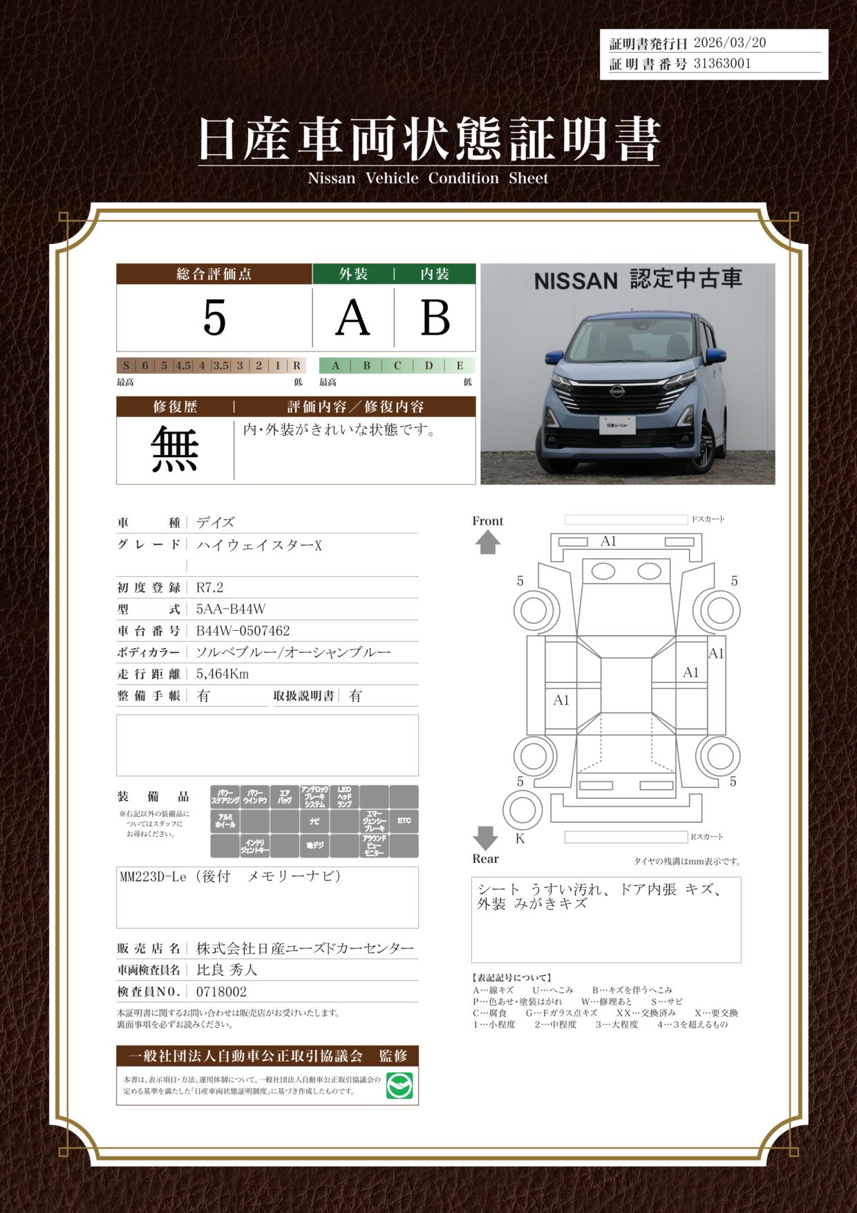 「車両状態証明書」は、査定協会監修のプロの検査員が公正かつ確かな基準で検査した”安心の証”です。