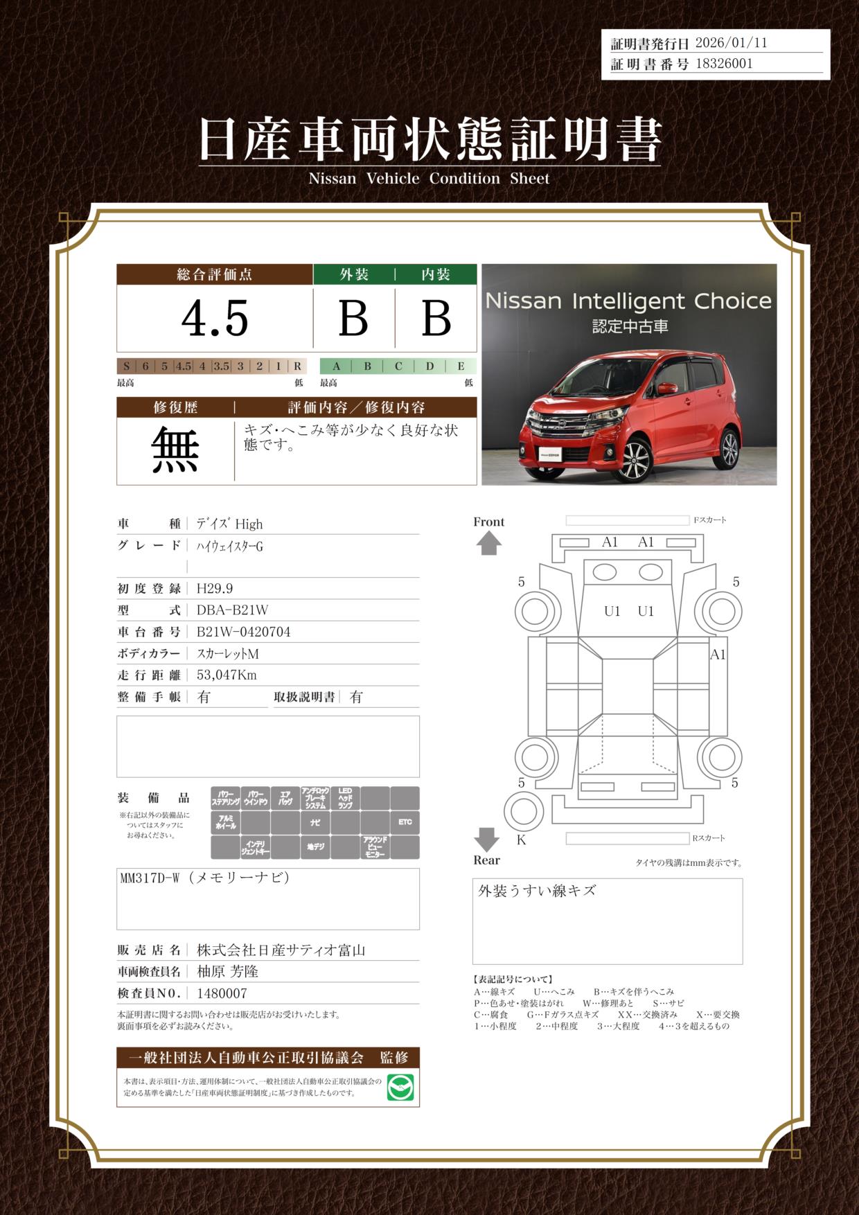 納車時に定期点検整備(費用は車両価格に含まれます。)