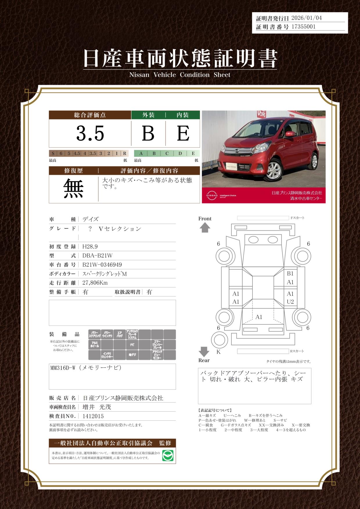 現状括弧書き内の年月まで車検有効期限が残っていますが、ご成約時に新しく車検を取り直します。なお取り直しの費用は車両価格に含まれています。