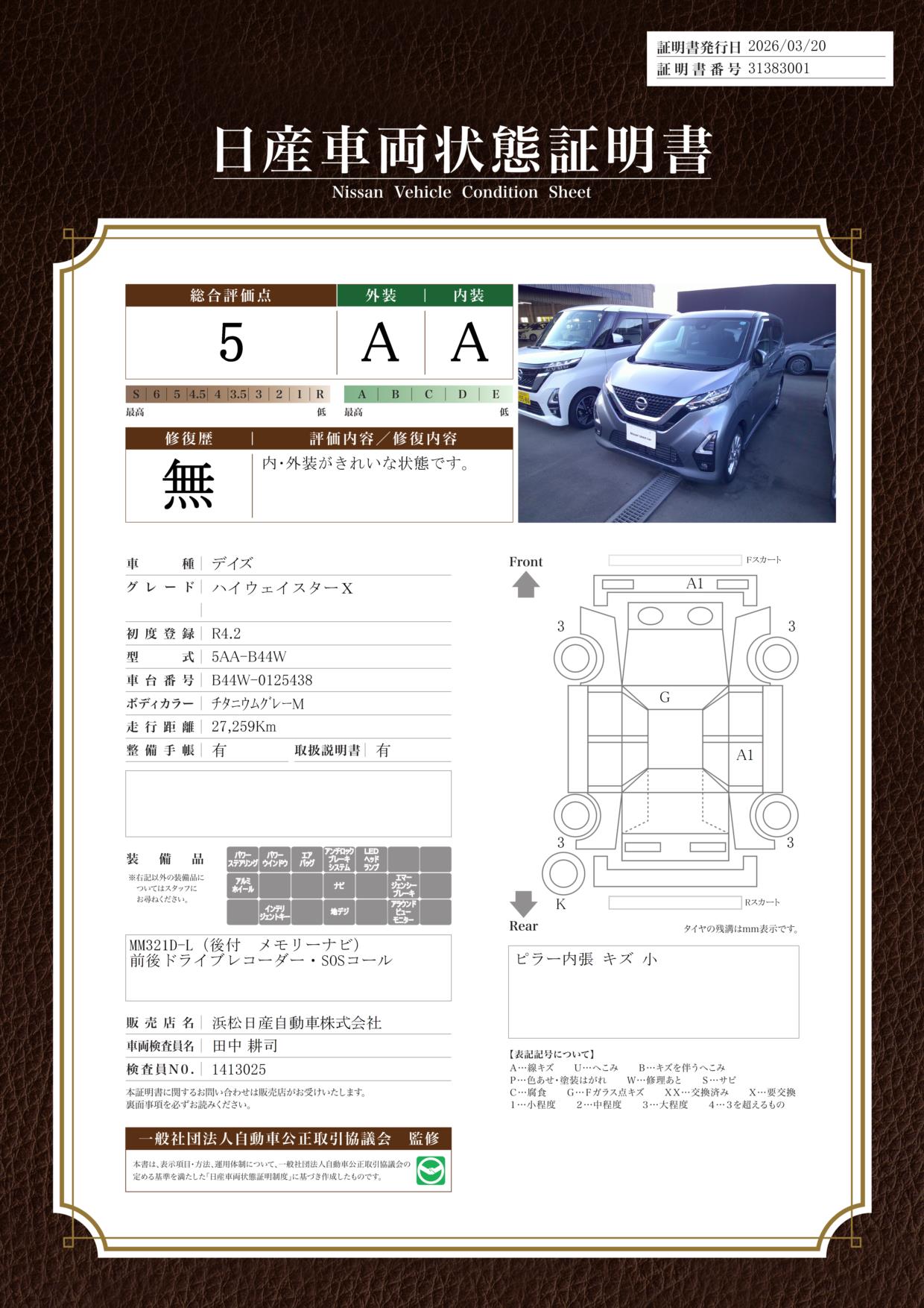 現状括弧書き内の年月まで車検有効期限が残っていますが、ご成約時に新しく車検を取り直します。なお取り直しの費用は車両価格に含まれています。