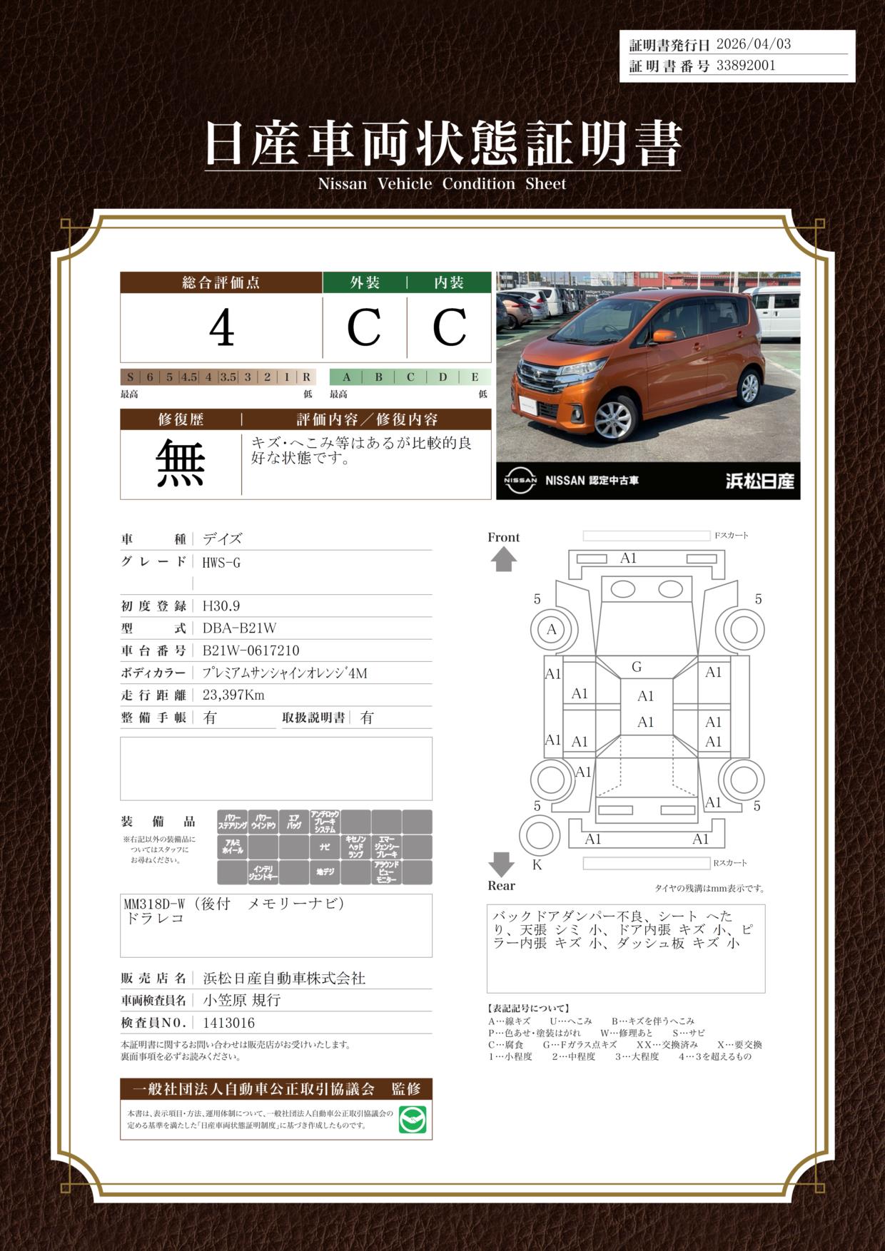 現状括弧書き内の年月まで車検有効期限が残っていますが、ご成約時に新しく車検を取り直します。なお取り直しの費用は車両価格に含まれています。