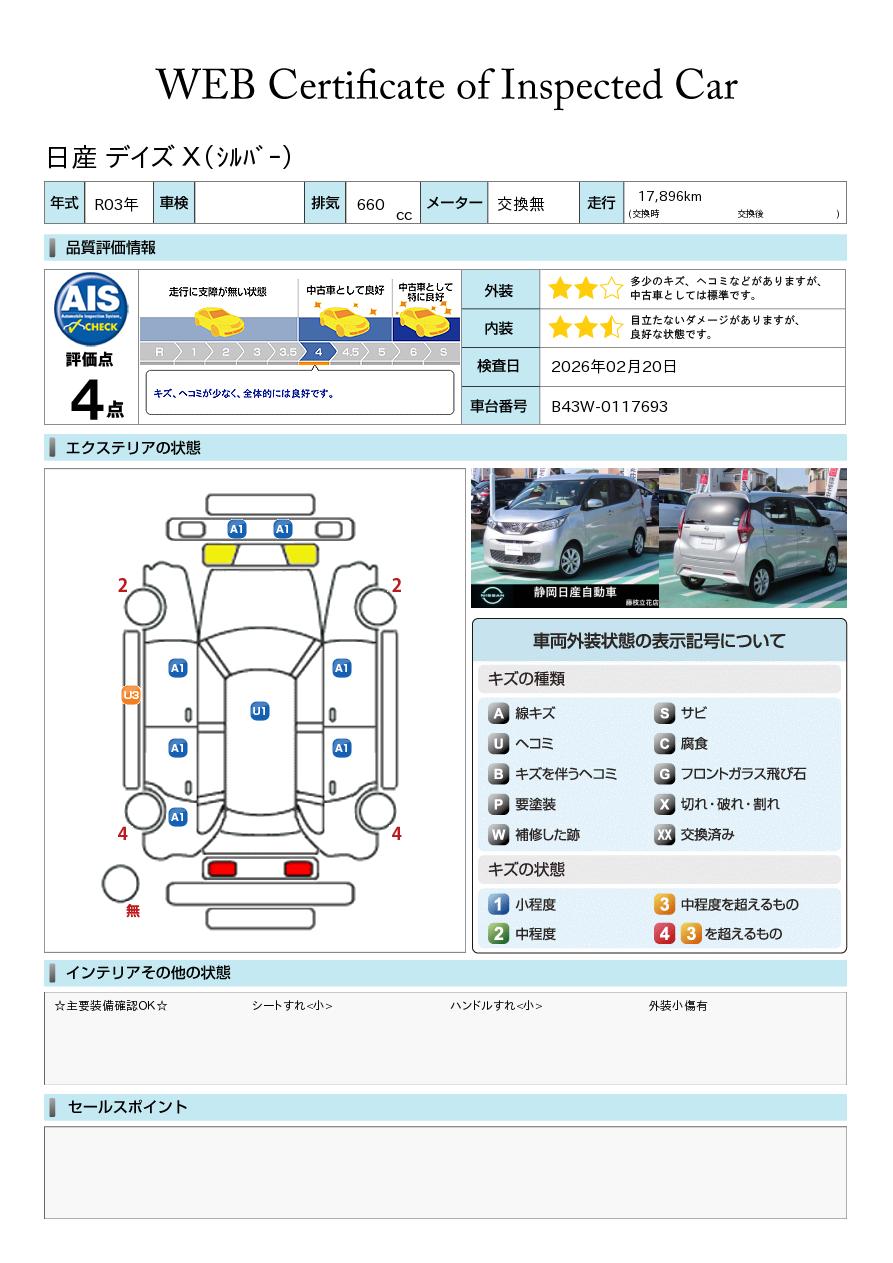 現状括弧書き内の年月まで車検有効期限が残っていますが、ご成約時に新しく車検を取り直します。なお取り直しの費用は車両価格に含まれています。