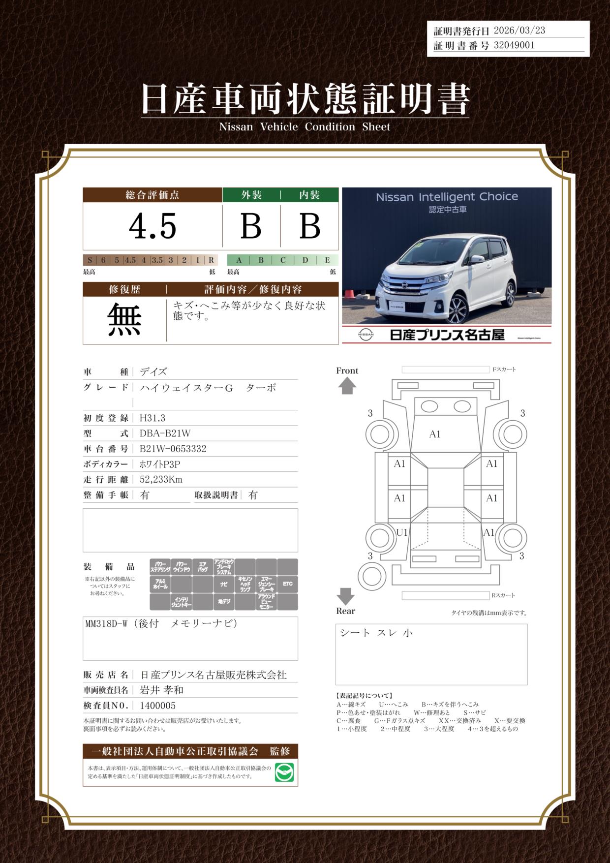 現状括弧書き内の年月まで車検有効期限が残っていますが、ご成約時に新しく車検を取り直します。なお取り直しの費用は車両価格に含まれています。