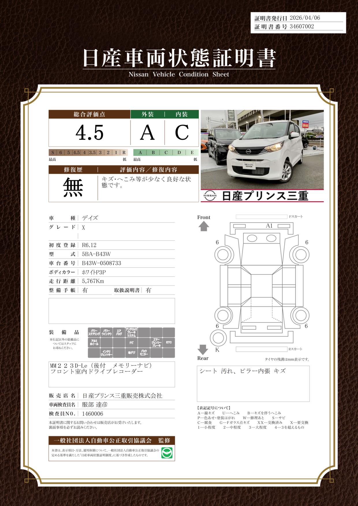 「車両状態証明書」は、査定協会監修のプロの検査員が公正かつ確かな基準で検査した”安心の証”です。