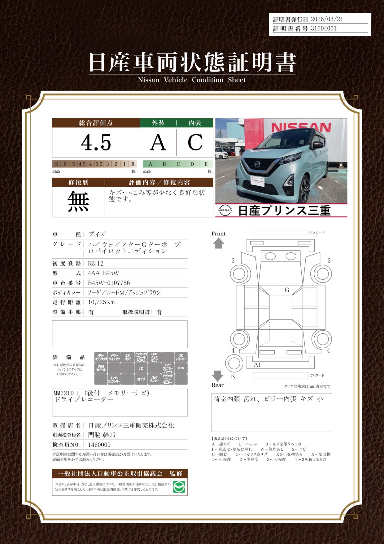 「車両状態証明書」は、査定協会監修のプロの検査員が公正かつ確かな基準で検査した”安心の証”です。