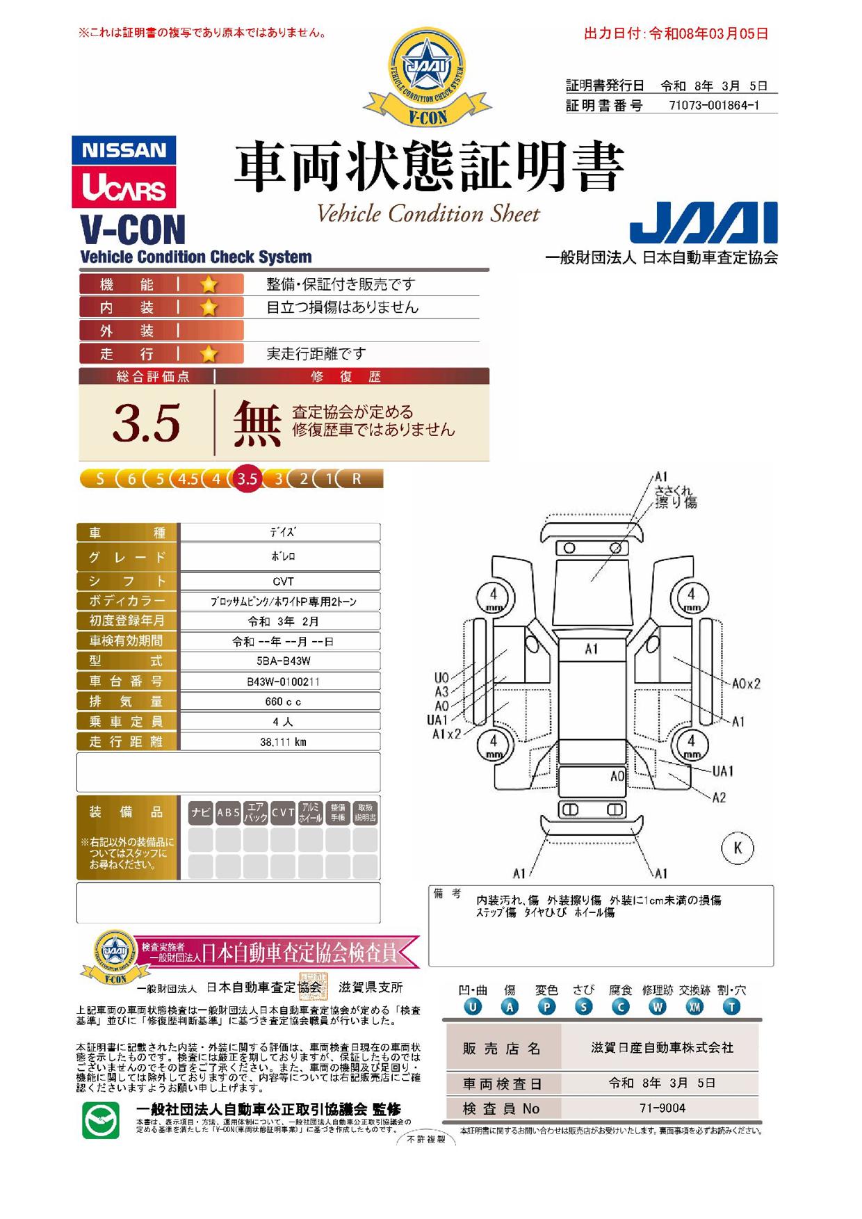 現状括弧書き内の年月まで車検有効期限が残っていますが、ご成約時に新しく車検を取り直します。なお取り直しの費用は車両価格に含まれています。