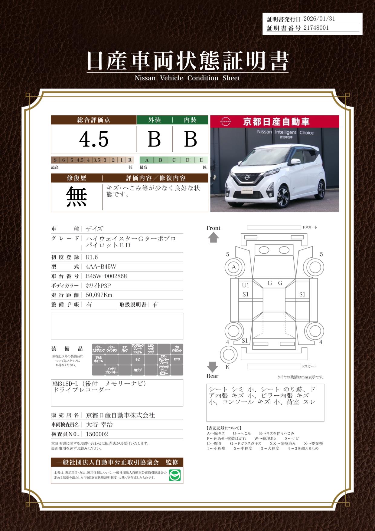 プロパイロットナビ全方位カメラドラレコETC当店では、ご安心頂く為に、ご来店頂きお車のご確認をおススメしております。