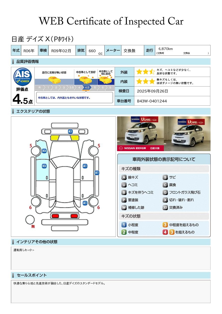 快適な乗り心地と先進技術が融合した、日産デイズのスタンダードモデル。当店のお車はトラブル防止の為、一度のご来店をお願いしております。