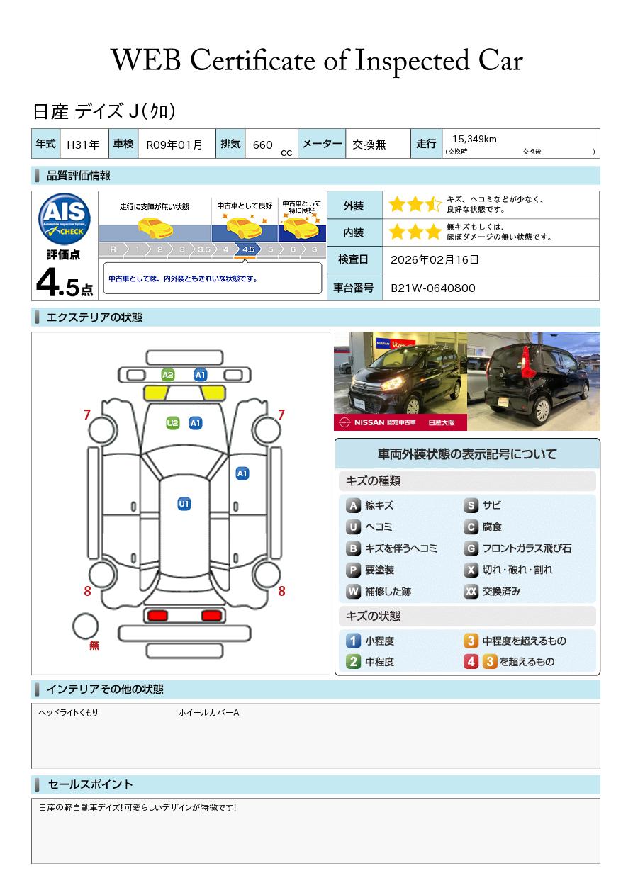 日産の軽自動車デイズ!可愛らしいデザインが特徴です!当店のお車はトラブル防止の為、一度のご来店をお願いしております。