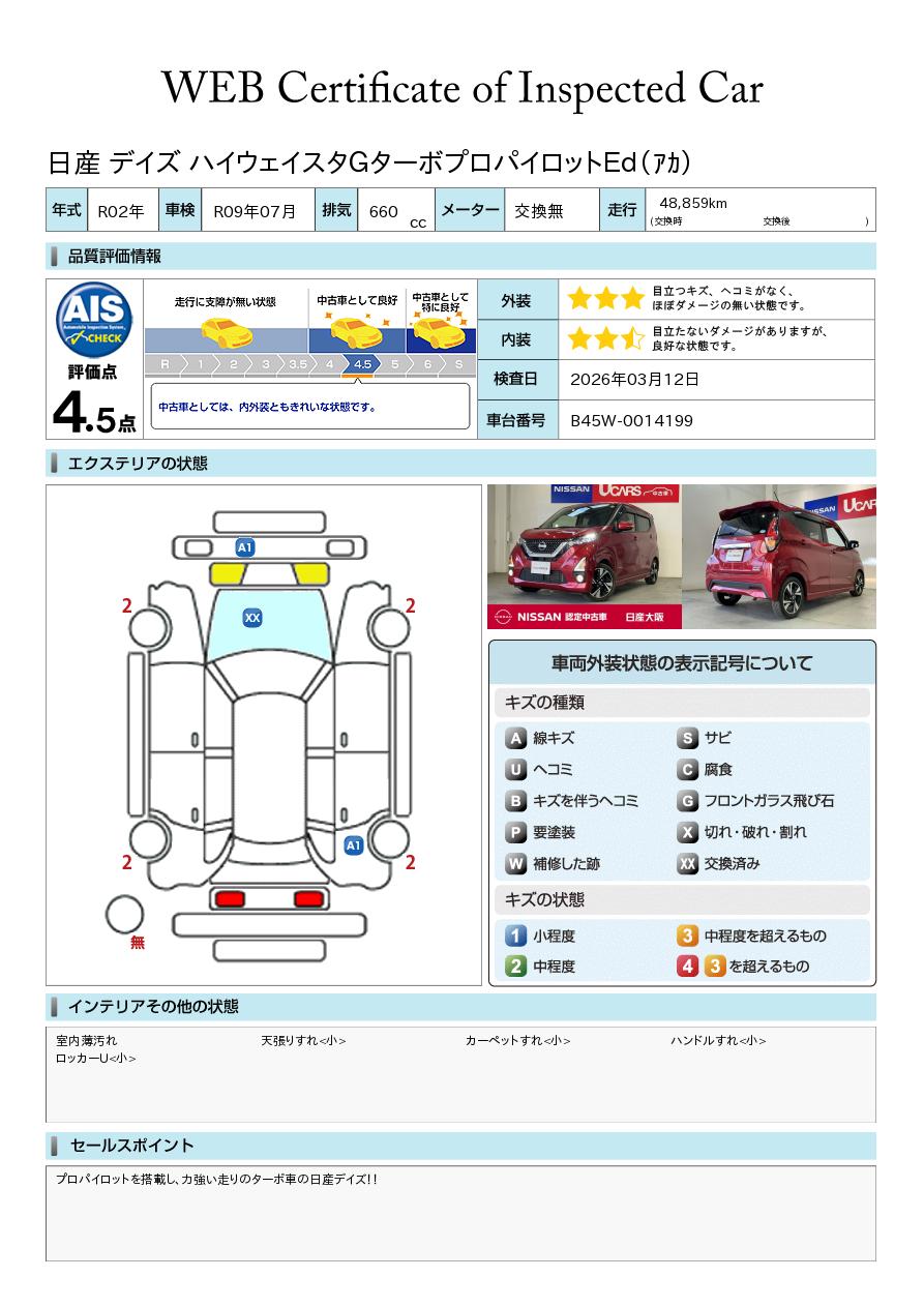 プロパイロットを搭載し、力強い走りのターボ車の日産デイズ!!当店のお車はトラブル防止の為、一度のご来店をお願いしております。