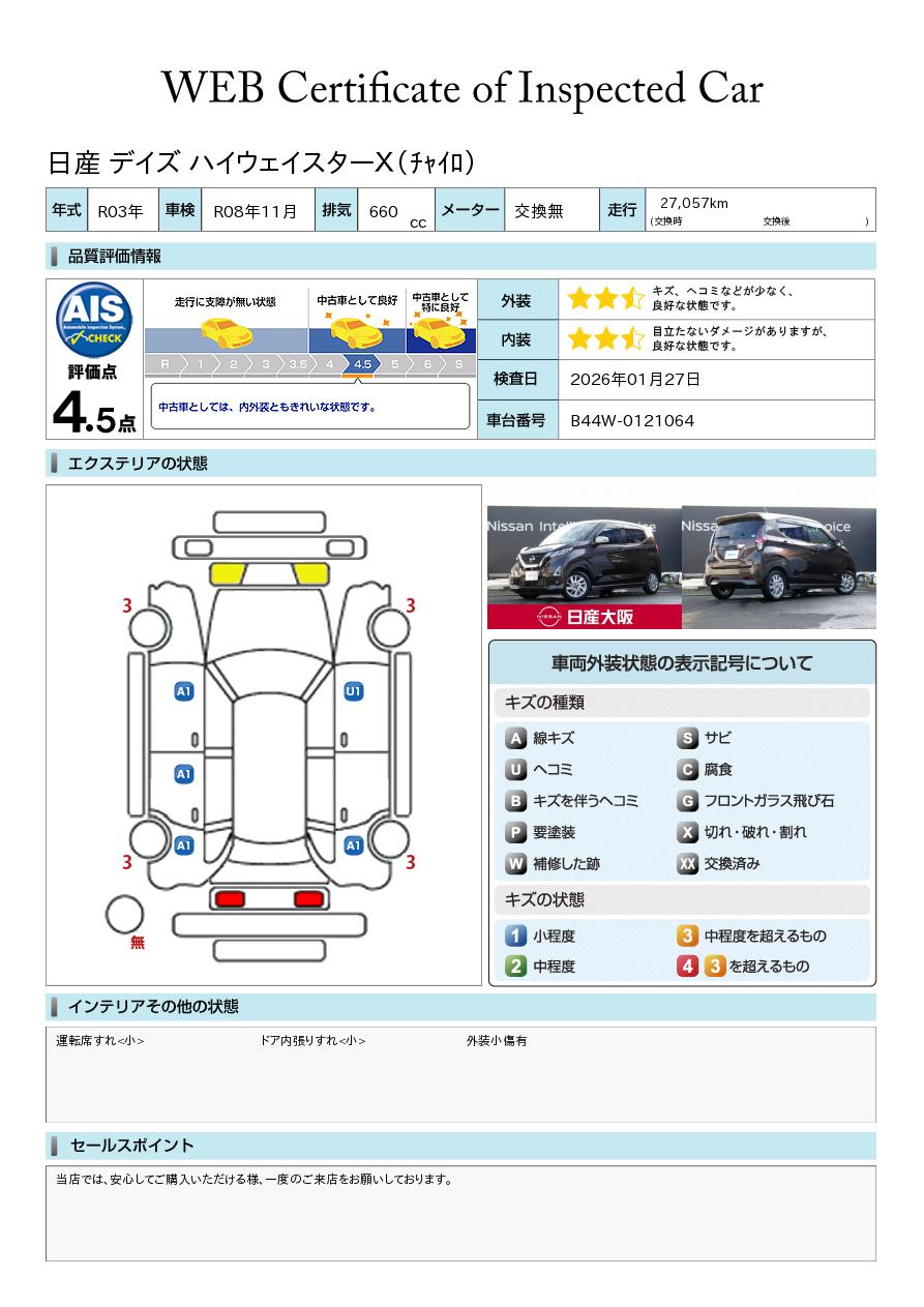 現状括弧書き内の年月まで車検有効期限が残っていますが、ご成約時に新しく車検を取り直します。なお取り直しの費用は車両価格に含まれています。