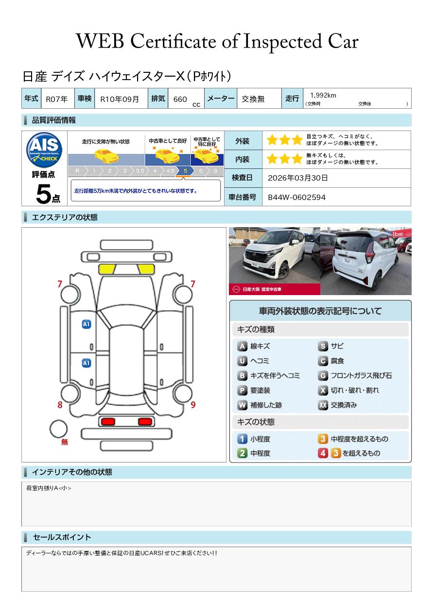 ディーラーならではの手厚い整備と保証の日産UCARS!ぜひご来店ください!!元試乗車のデイズです!人気色のホワイトパールのハイウェイスターですよ!!