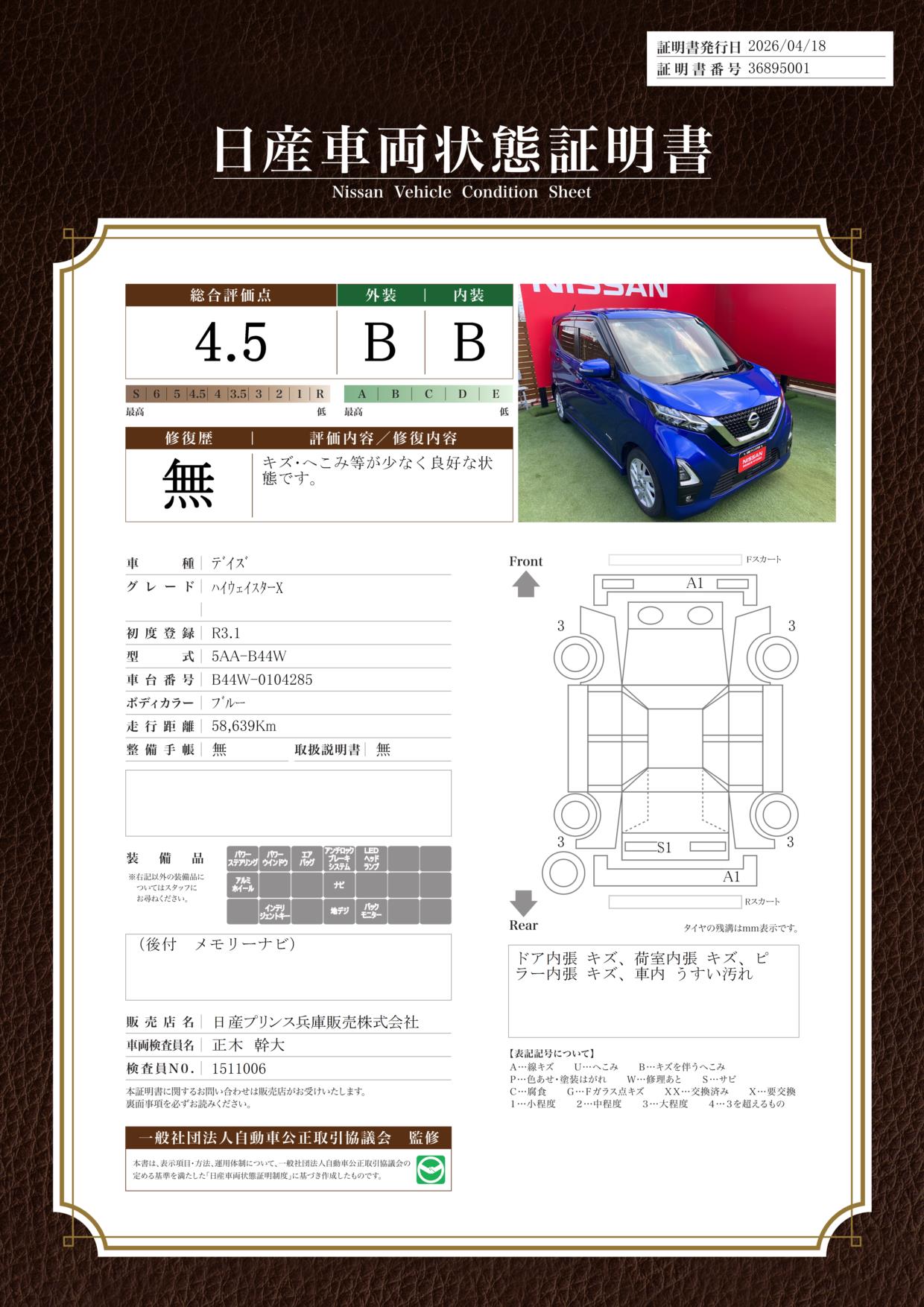 現状括弧書き内の年月まで車検有効期限が残っていますが、ご成約時に新しく車検を取り直します。なお取り直しの費用は車両価格に含まれています。