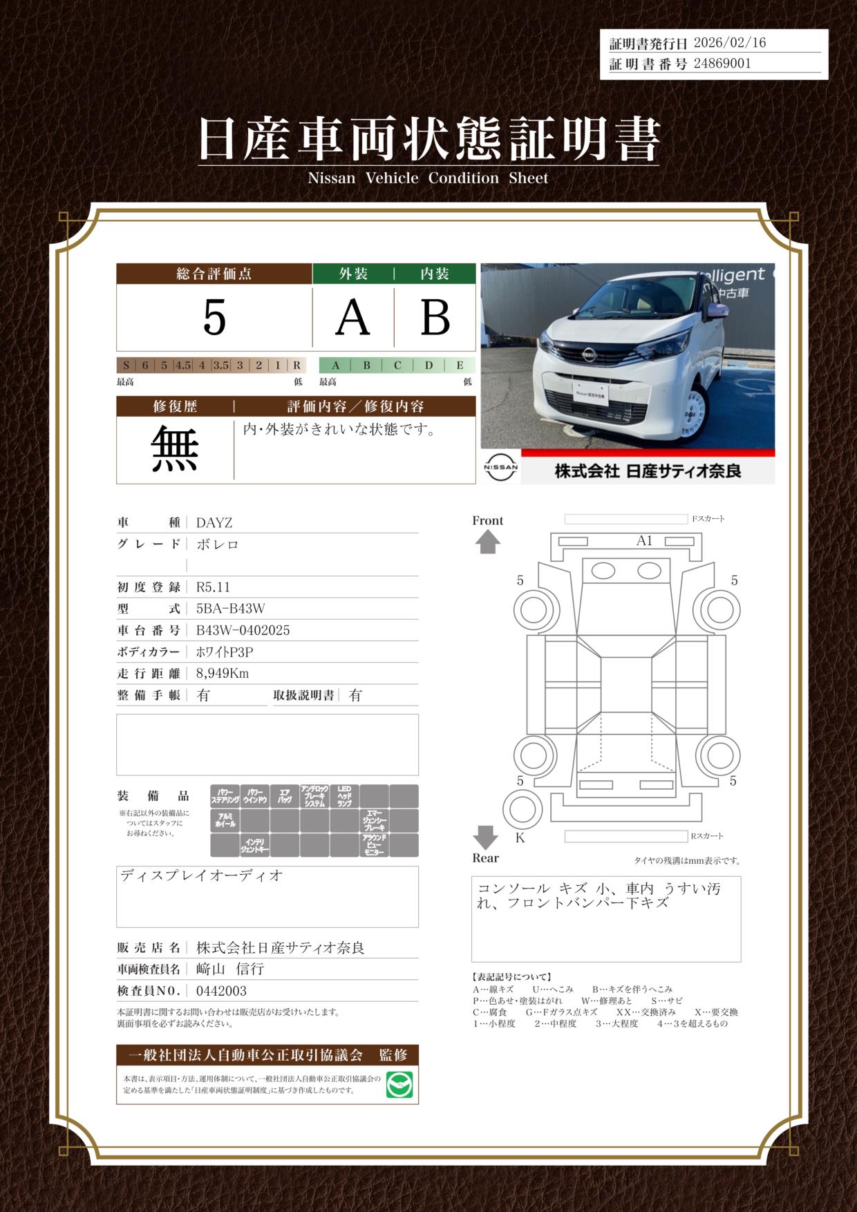 現状括弧書き内の年月まで車検有効期限が残っていますが、ご成約時に新しく車検を取り直します。なお取り直しの費用は車両価格に含まれています。