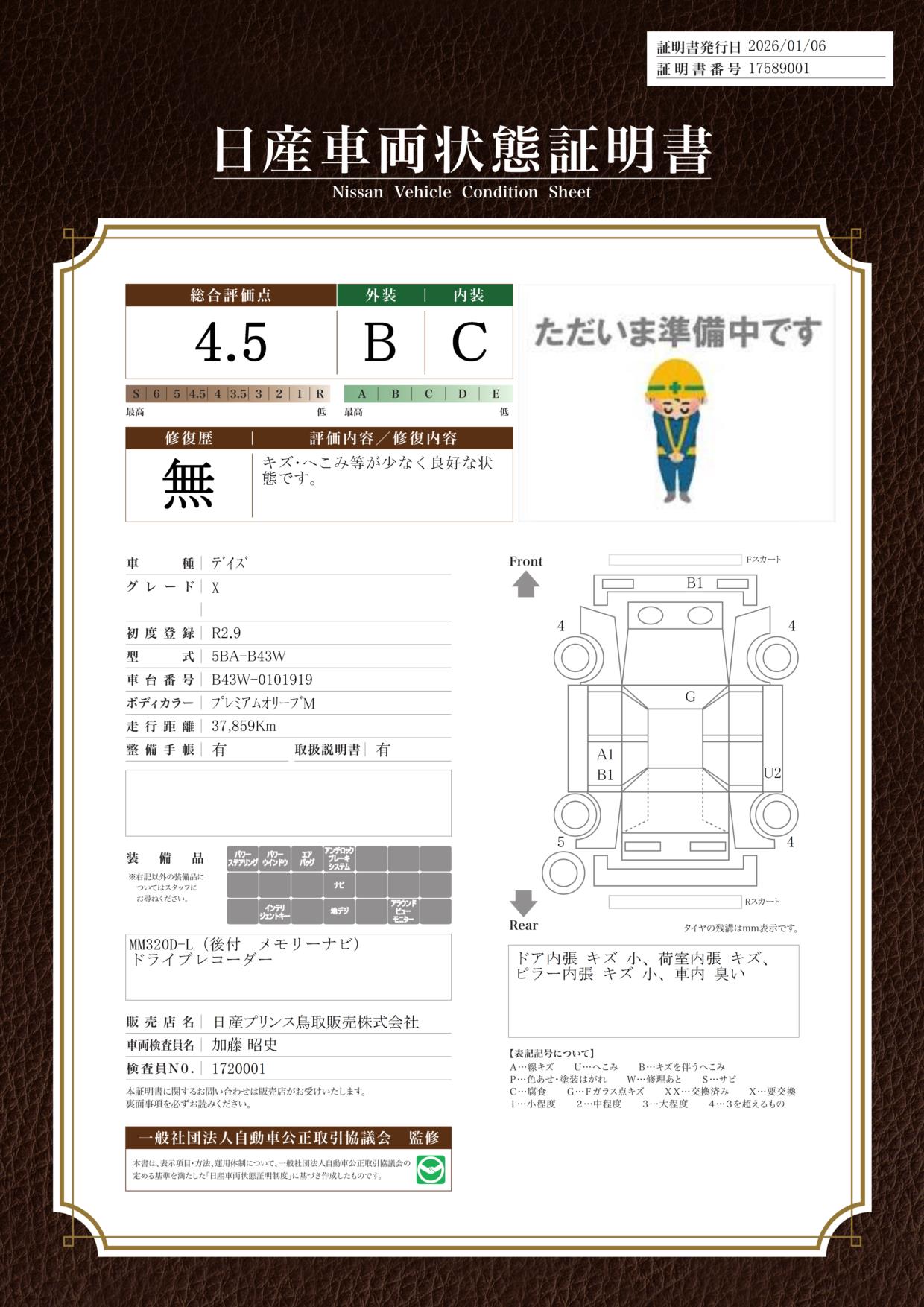評価機関 : 日産車両状態証明