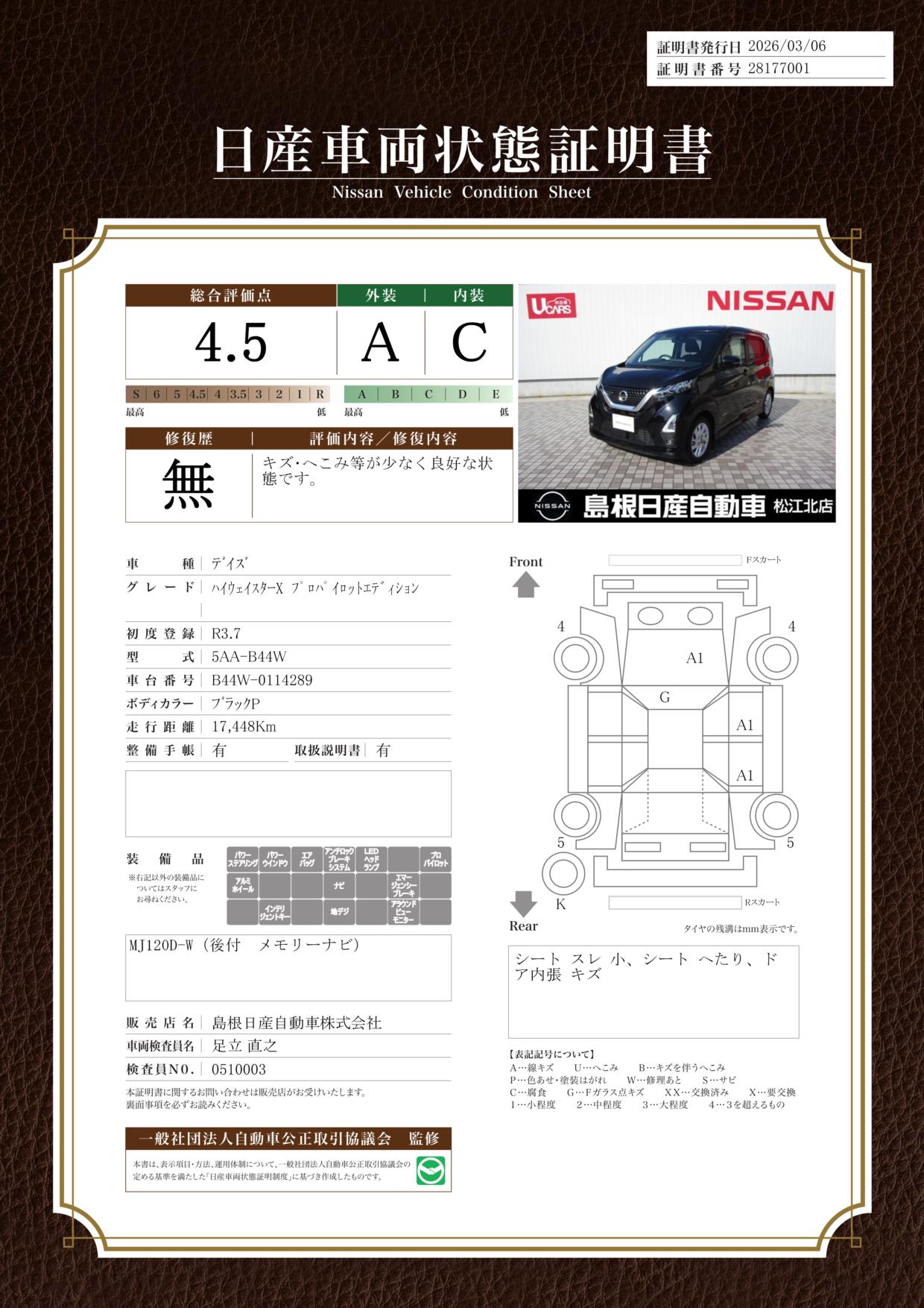 ☆この度は当店在庫車をご覧頂き誠にありがとうございます♪ 当店はサービス工場を併設しておりますのでオイル交換はもちろん、車検、点検、鈑金などトータルでサポートさせて頂きます。 展示台数は少ないですが、日産ディーラーならではの良質なお車を展示しておりますのでお気に入りの1台が見つかると思います♪ お気軽にご来店・お問い合わせください! ☆なおご来店の際は、国立島根大学・松江キャンパスを目印にお越しください(^^♪