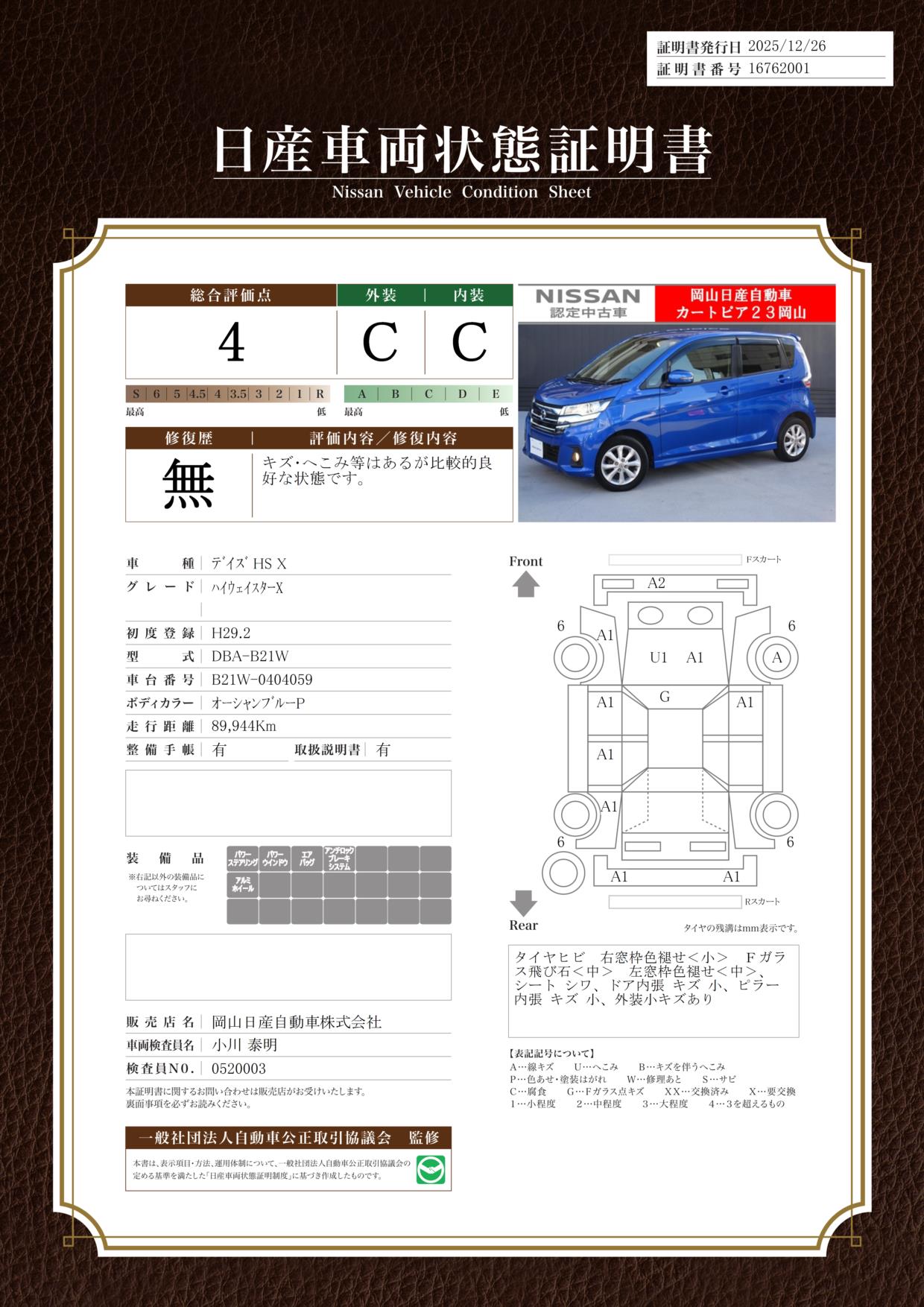 岡山日産 カートピア23岡山のホームページをご確認ありがとうございます。 当店はサービス工場のある全国でも数少ない中古車店舗となります。 ご購入後のメンテナンスも当店自慢のサービススタッフにお任せ下さい! 全車保証付きのディーラーならではの高品質なお車をご用意しております。 当社使用の試乗車、社用車も多数用意しています。 中古車選びのサポートを全力で致します!! 迷ったらまずはご連絡下さい。 遠方の方は、メール、電話でお気軽にお問い合わせ下さい。