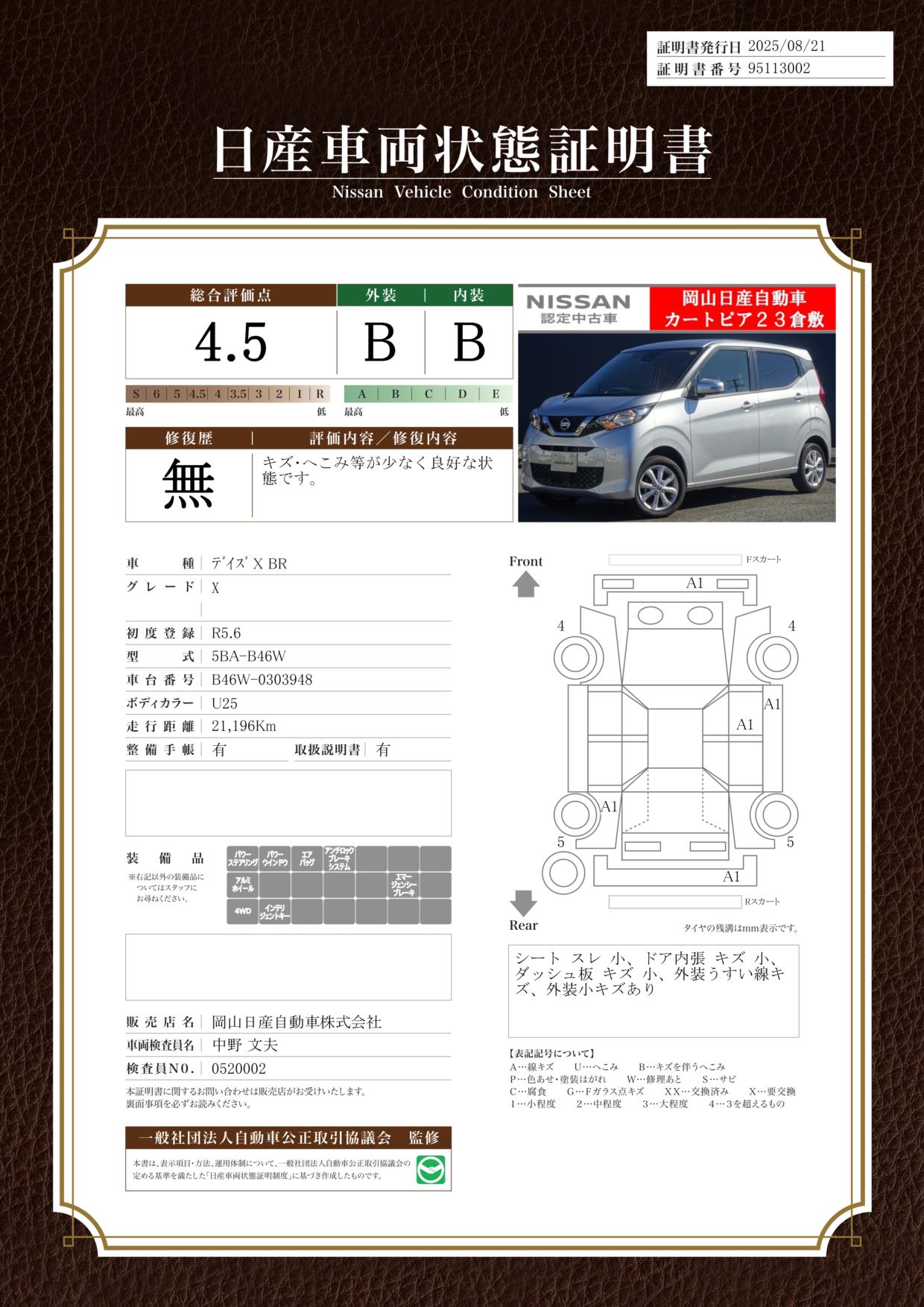 評価機関 : 日産車両状態証明