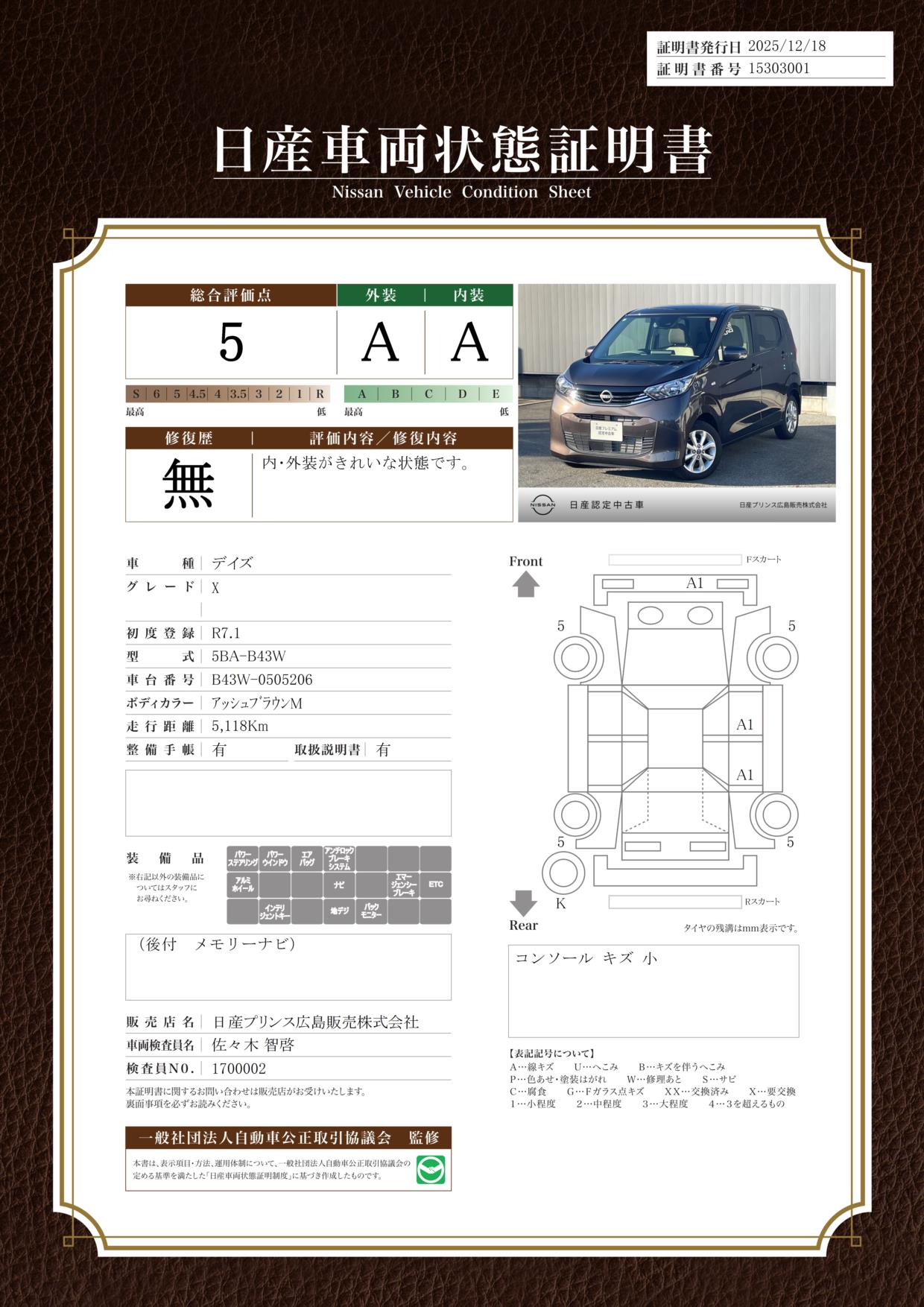 現状括弧書き内の年月まで車検有効期限が残っていますが、ご成約時に新しく車検を取り直します。なお取り直しの費用は車両価格に含まれています。
